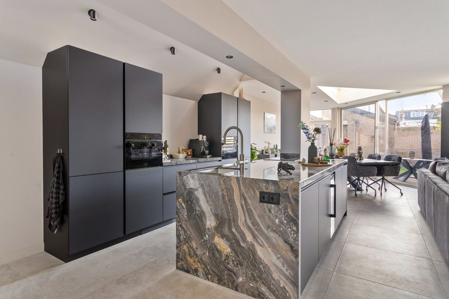 Woonkamer, keuken en eethoek bevinden zich in één ruimte. De eigenaren hebben een muur verwijderd en een open keuken gerealiseerd met een kookeiland. De keuken bestaat uit een kastenwand tegen de muur met daarin een stoomoven, een hete-lucht oven, een grote koel/vries combinatie en een koffiecorner uitgevoerd in exclusief marmer.