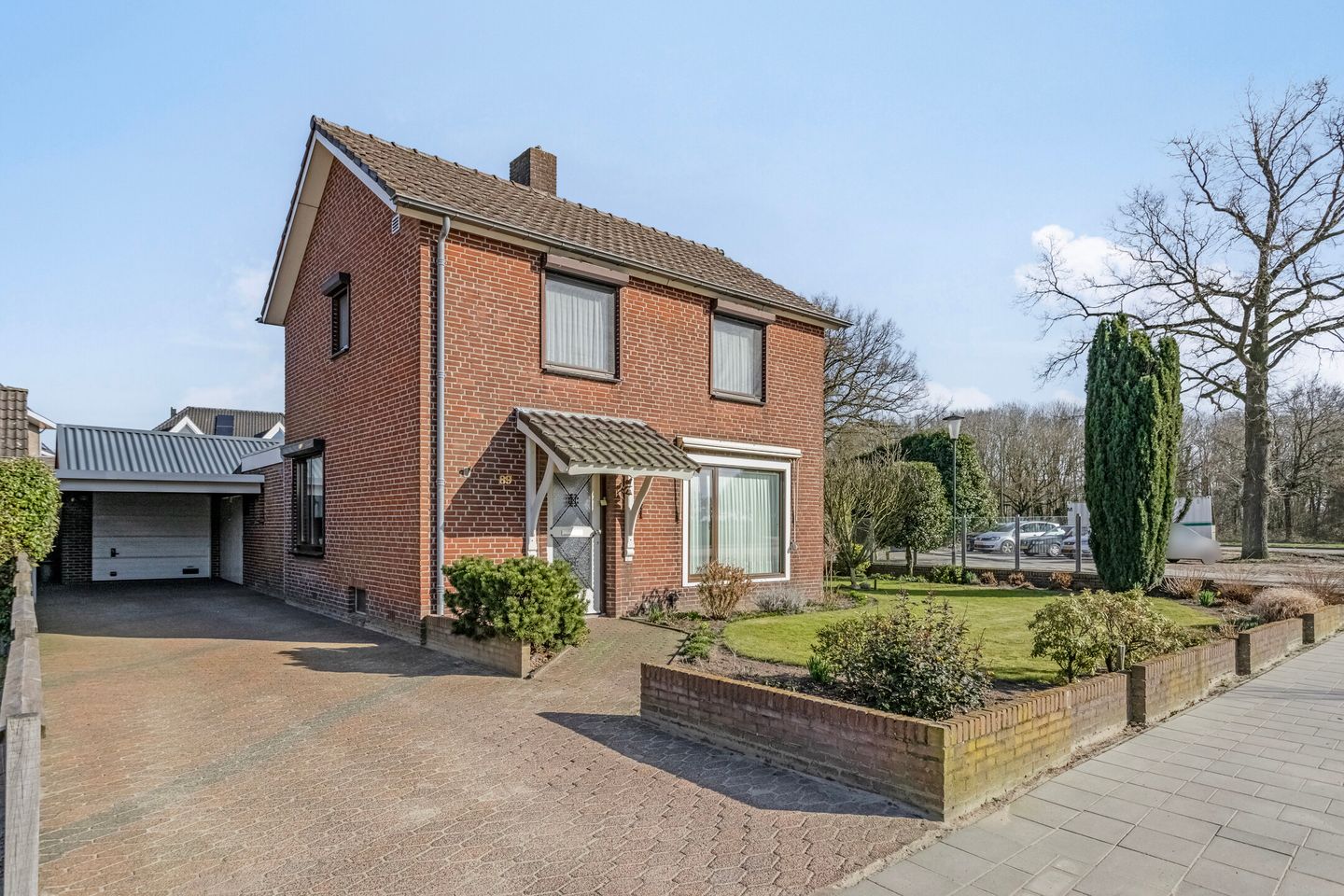 Aan de linkerzijde van de woning is een oprit met carport voor de garage. Groen aangelegde voortuin met gazon, diverse struiken en vaste beplanting. Via een pad vanaf de oprit is de overdekte entree bereikbaar.