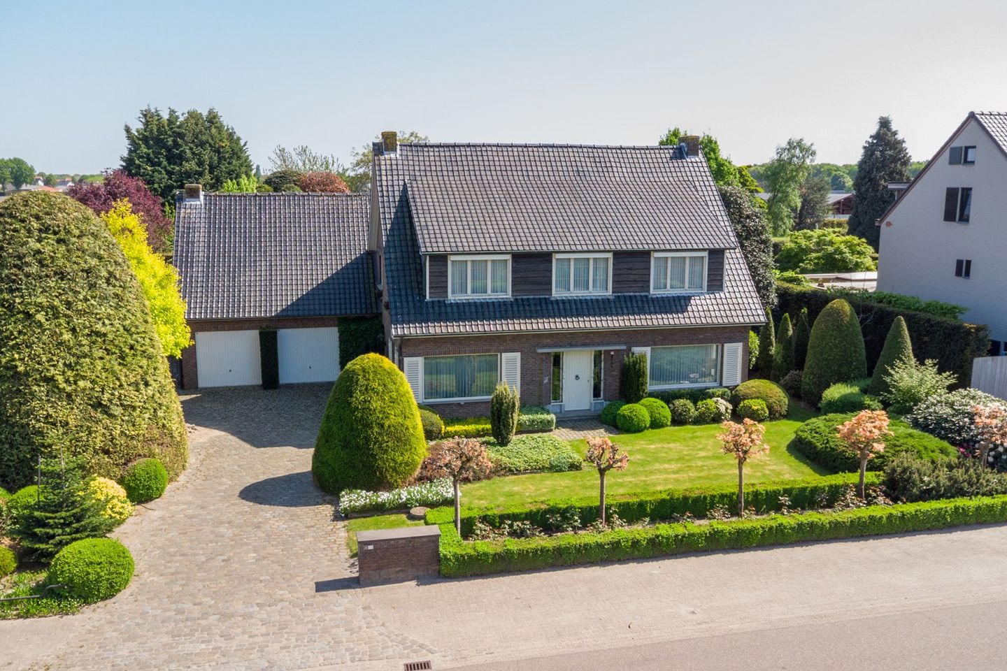 De woning beschikt over een fraai en sfeervol aangelegde parkachtige tuin. De voortuin beschikt onder andere over vaste groene beplanting, gazon, een met sierbestrating aangelegde oprit, met ruimte voor meerdere auto’s en toegang tot de dubbele garage.