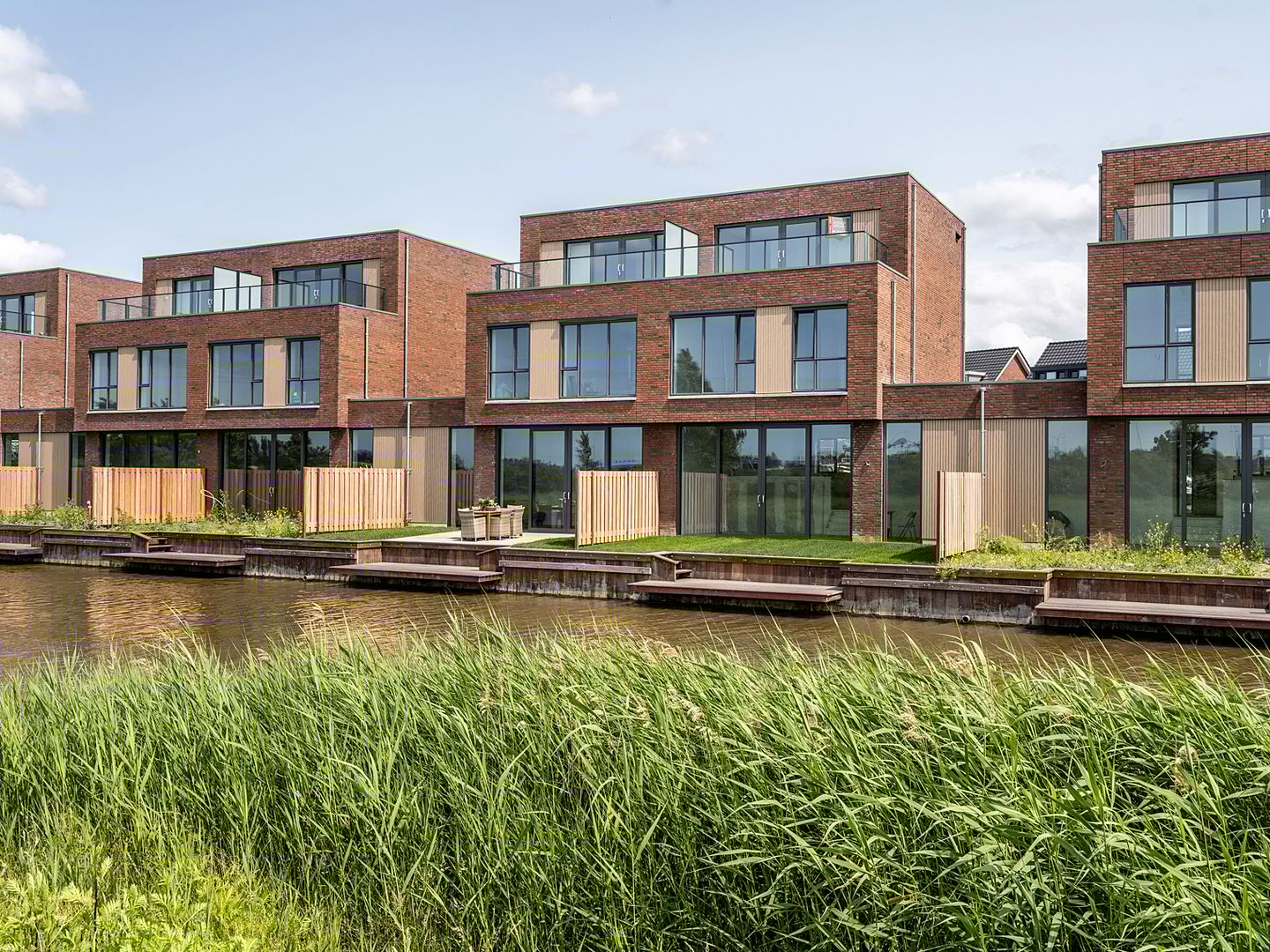 Three-story home with symmetrical lines, light brown brick and a beautiful window frame. Walk to the back and it's all glass with a ceiling height of 330cm! Glass to enjoy the water views. Downstairs the evening sun-facing garden with decking, upstairs, adjacent to the unique master bedroom, a large roof terrace as additional outdoor living space.