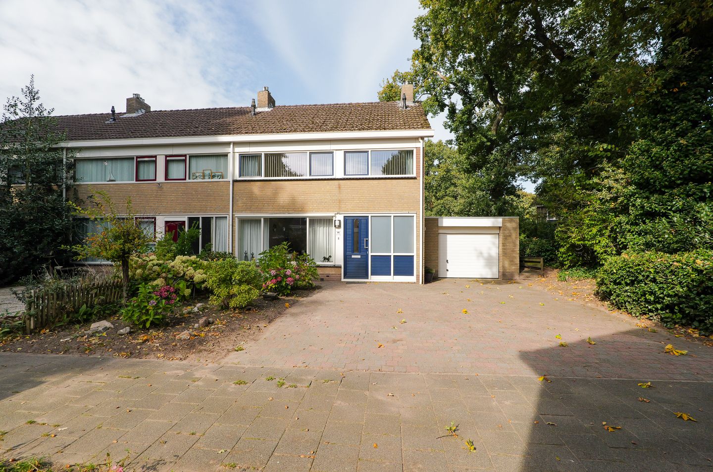 Ruime hoekwoning met garage en groene omgeving.