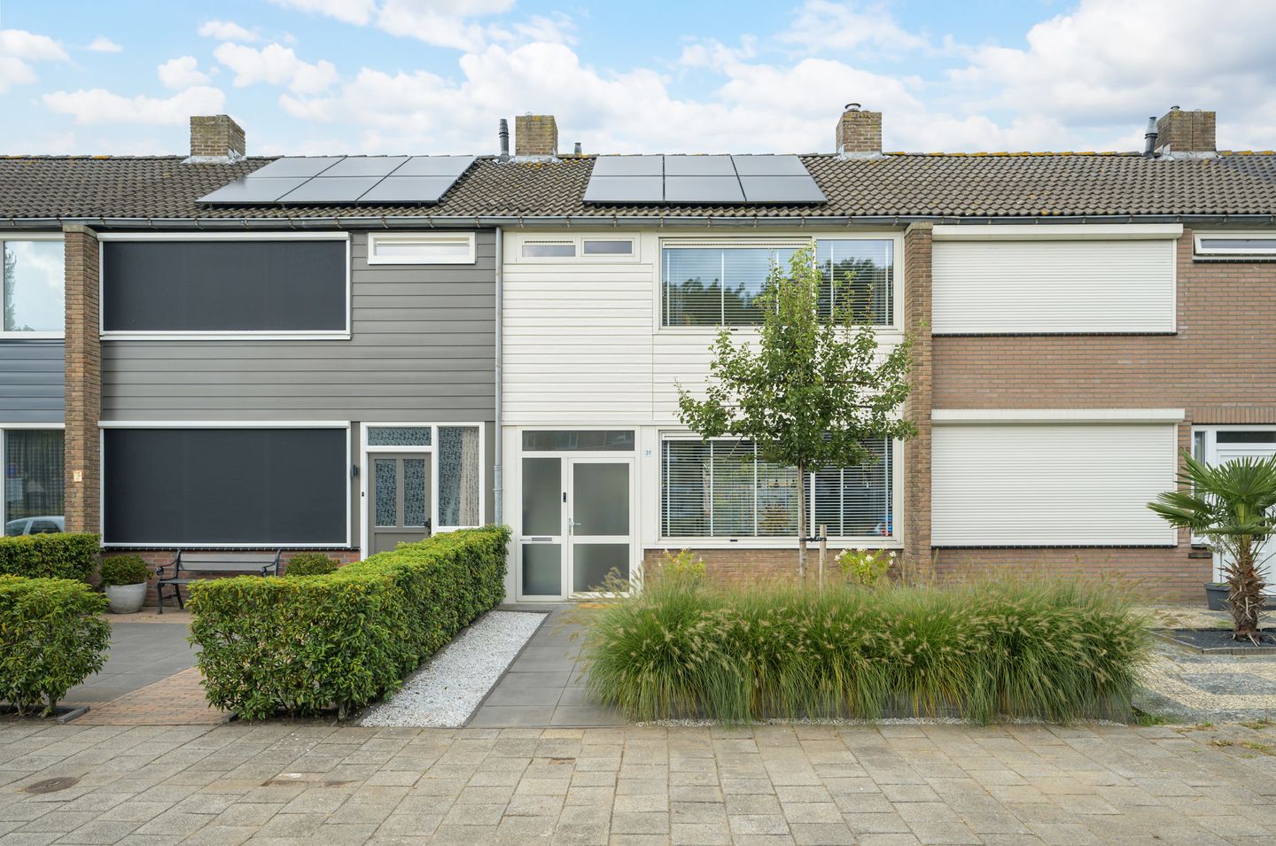 Middels fraai aangelegde, met grotendeels sierbestrating, voortuin is er toegang tot de entree van de woning.