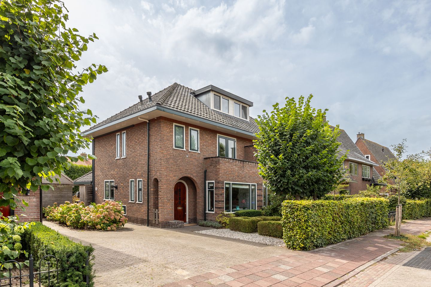 De voortuin is strak aangelegd met beukenhaag en leibomen, en biedt de mogelijkheid om de auto op eigen terrein te parkeren.