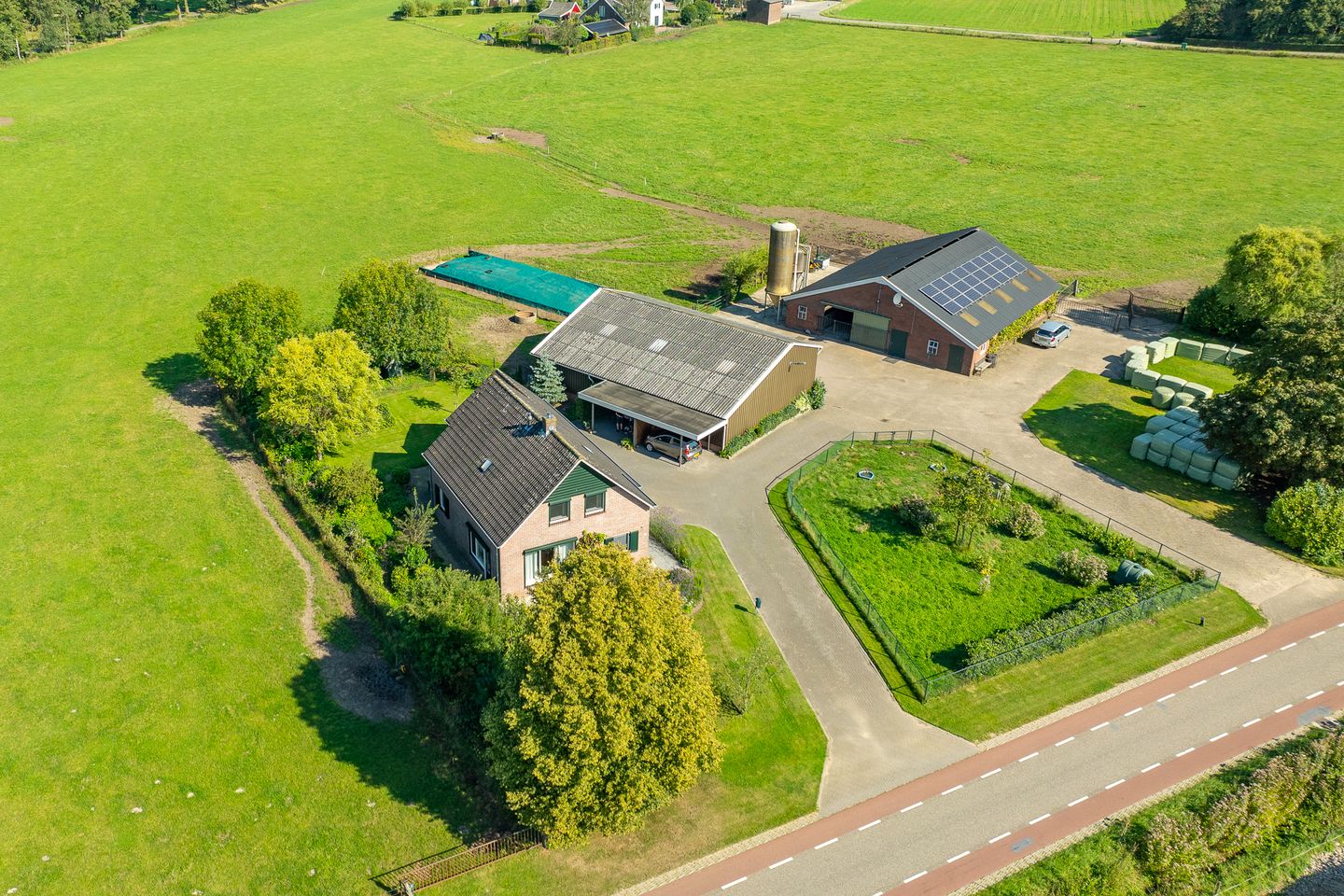 Het perceel met een oppervlakte van 4.800 m² is functioneel ingedeeld met een dubbele oprit, wat hobbyweitjes/speelruimtes, een fijne tuin bij de woning en wat uitloopmogelijkheden voor de dieren vanuit de stal. Op het perceel is tevens nog een zogeheten sleufsilo gelegen voor opslag en voorraad van voer. De 4,4 hectare grond die separaat bijgekocht kunnen worden, liggen rondom de woning met schuren, en is thans als weiland in gebruik.