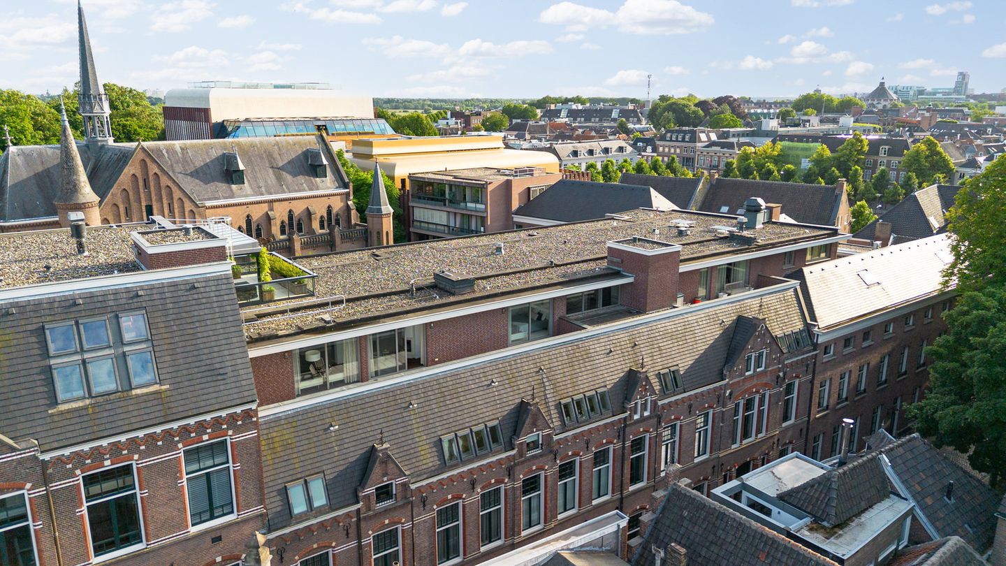 Overal in de woonkamer vormt de indrukwekkende neogotische kruisbasiliek op het binnenterrein van het klooster een stemmig ‘behang’ dat, door het vele glas aan de zonnige zuidzijde van het penthouse, zichtbaar is. Hoewel u hier hoog boven het stedelijke rumoer leeft, komt de sfeer van buiten zo wel degelijk binnen.