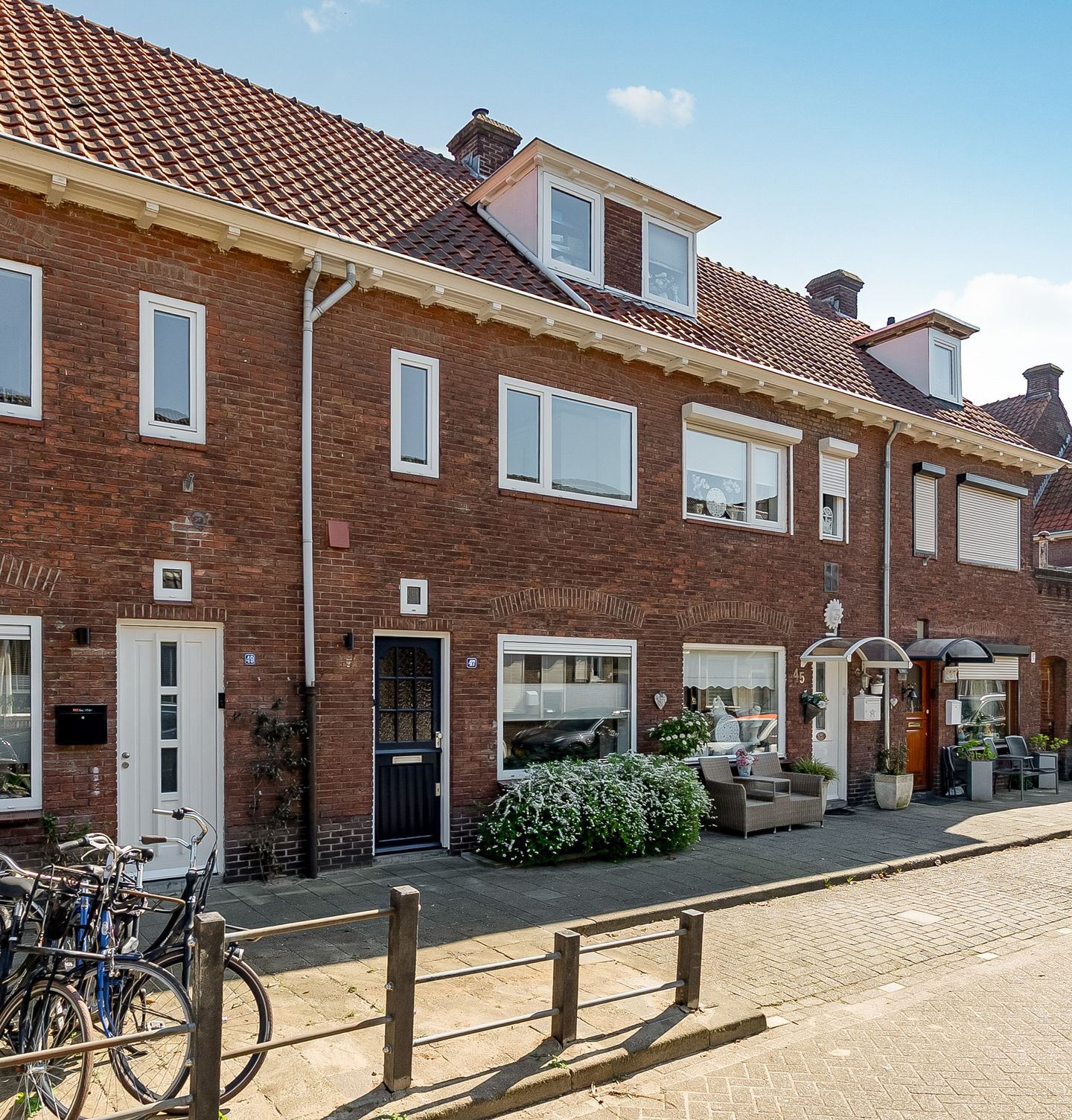 Ook de voorgevel van dit huis is ontzettend charmant dankzij de warme kleur bakstenen en de boogvormige rollagen boven de ramen. De voordeur heeft een mooie roedeverdeling en een schattig raampje erboven. Je komt binnen in de hal met garderobekast, meterkast en trapkast waarna je doorloopt naar de woonkamer.