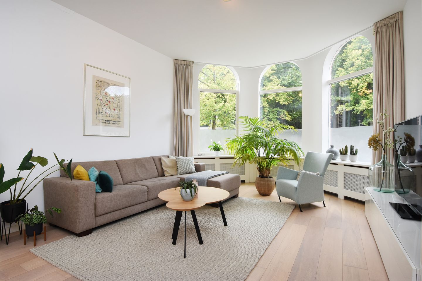 Ruime gemeenschappelijke hal, entree appartement. Royale woon-/eetkamer met kenmerkende ronde kozijnen aan de voorzijde en hoog plafond. Moderne luxe open keuken in L-opstelling voor zien van praktisch bar gedeelte, hardstenen werkblad en alle benodigde inbouwapparatuur (koelkast, vriezer, vaatwasser, twee combi oven-magnetrons, Quooker, 5-pits gaskookplaat en afzuigkap met afvoer naar buiten). Grote hoofdslaapkamer aan de achterzijde met openslaande deuren naar de fijne achtertuin op het zuidoosten met groot terras en houten berging voorzien van elektra en twee zonnepanelen. Via gang naar de tweede ruime slaapkamer welke eveneens toegang heeft tot de tot de tuin. Moderne luxe badkamer voorzien van inloopdouche met rainshower, ligbad, vaste wastafel in meubel en designradiator. Separaat modern toilet met fontein. Goed formaat kelder (ca. 13m2) met uiteraard veel bergruimte, opstelplaats voor de CV-combiketel, mechanische ventilatiebox en plek voor de wasmachine en droger.