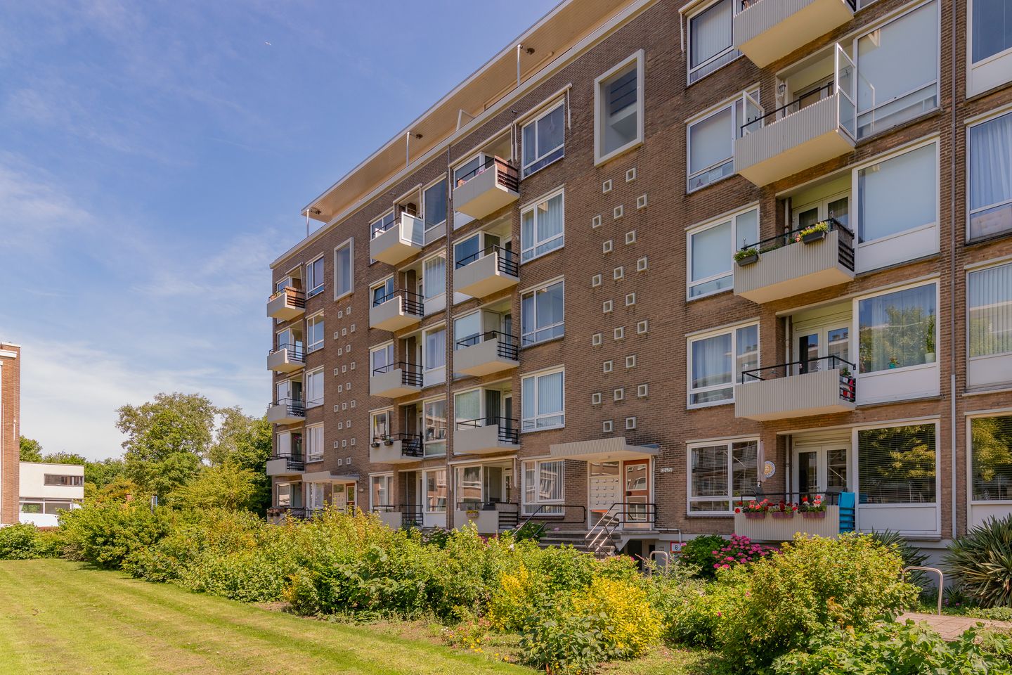 Via afgesloten portiek met bellen-en brieventableau, centrale hal, lift of trappenhuis naar 2e etage, voordeur, meterkast, toilet met fontein, centrale vormige hal ca. 3,15 x 2,80 met intercom installatie, deur met roedeverdeling naar gezellige lichte wooneetkamer ca. 10,90 x 3,70 met openslaande deuren naar gezellig zonnig balkon ca. 2,00 x 1,85 met leuk vrij uitzicht op binnentuin en groen.