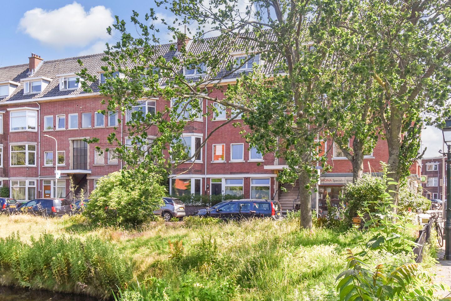 This inviting living space features original en suite doors with four built-in wardrobes, providing a refined and tranquil ambiance. The front room, with its bay window, overlooks the water and greenery of the Pomonaplein—ideal for relaxing by the fireplace in a truly serene setting.