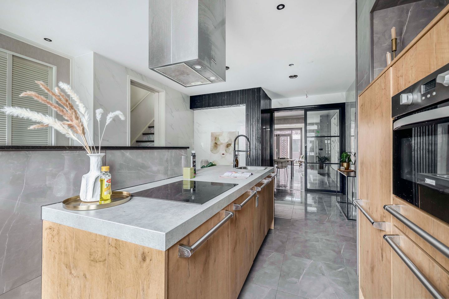 Via de voortuin kom je binnen in de modern ingerichte keuken die voorzien is van eiland en inbouwapparatuur. Hier bevindt zich ook een garderobekast om jassen en tassen netjes op te bergen.