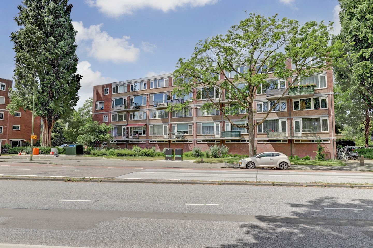 De woonkamer is heerlijk licht en ruim, en via de deur stap je zo het balkon op – met uitzicht over de groene omgeving van de Hugo van Gijnweg. De keuken is strak en praktisch ingericht, gescheiden van de woonkamer met een tussenwand van glazen blokken.