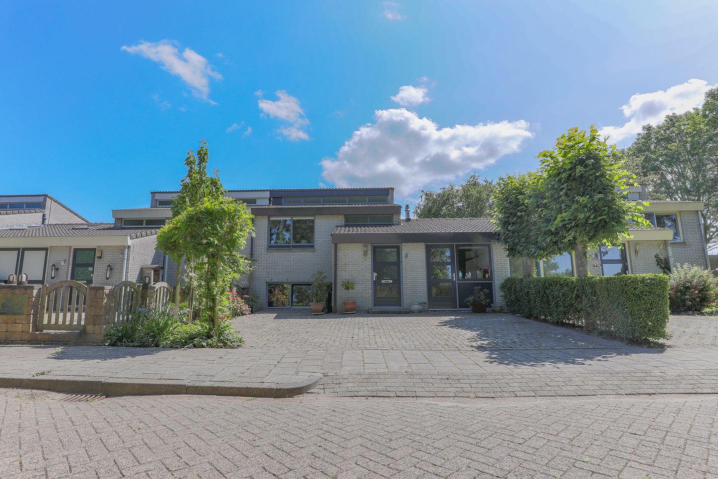 Het esthetisch vormgegeven exterieur spreekt tot de verbeelding met de lichte gevelsteen in contrast met de hedendaagse grijze kleurstelling van het schilderwerk. De royale veranda met dito berging, welke de gehele breedte van de achtertuin bestrijkt, is in een evenzo moderne kleurstelling uitgevoerd en een plaatje om te zien. In combinatie met de moderne tuintegel, het onderhoudsvriendelijke karakter en de ideale zonligging vormt dit geheel een achtertuin om van te genieten. De woonkamer staat middels een buitentrap in verbinding met de tuin, wat op mooie zomerdagen zonder meer voor een extra dimensie zorgt, terwijl ook de bijkeuken middels een loopdeur toegang biedt.