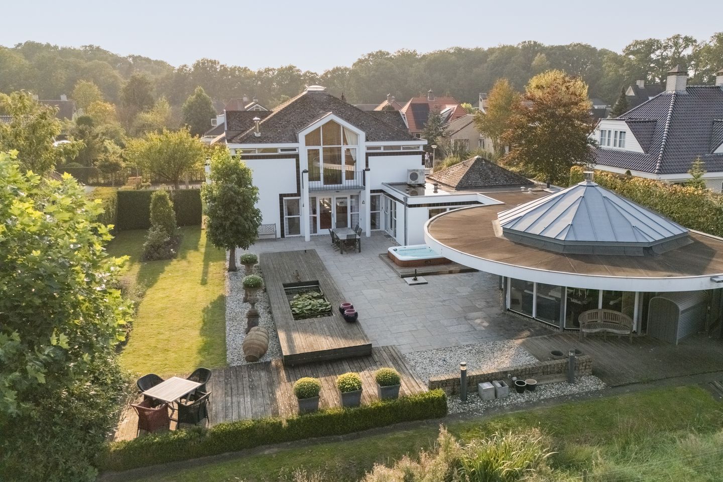 Oorspronkelijk heeft het huis de naam "Villa Domenica", oftewel Villa Zondag. En die naam is bijzonder treffend. Genieten van de zon kan de hele dag door! De kavel is namelijk ruim en mooi breed waardoor er op ieder moment van de dag ruimschoots van de zon genoten kan worden. De strakke lay-out van het huis zie je ook weer in de tuin terug. Een ruim terras met grote tegels, een fraaie vlonder en een strak gazon. De natuur is dichtbij. We hebben al een paar keer benadrukt dat de locatie zo bijzonder is, want waar kijk je vanuit je tuin nou uit over het buitengebied?