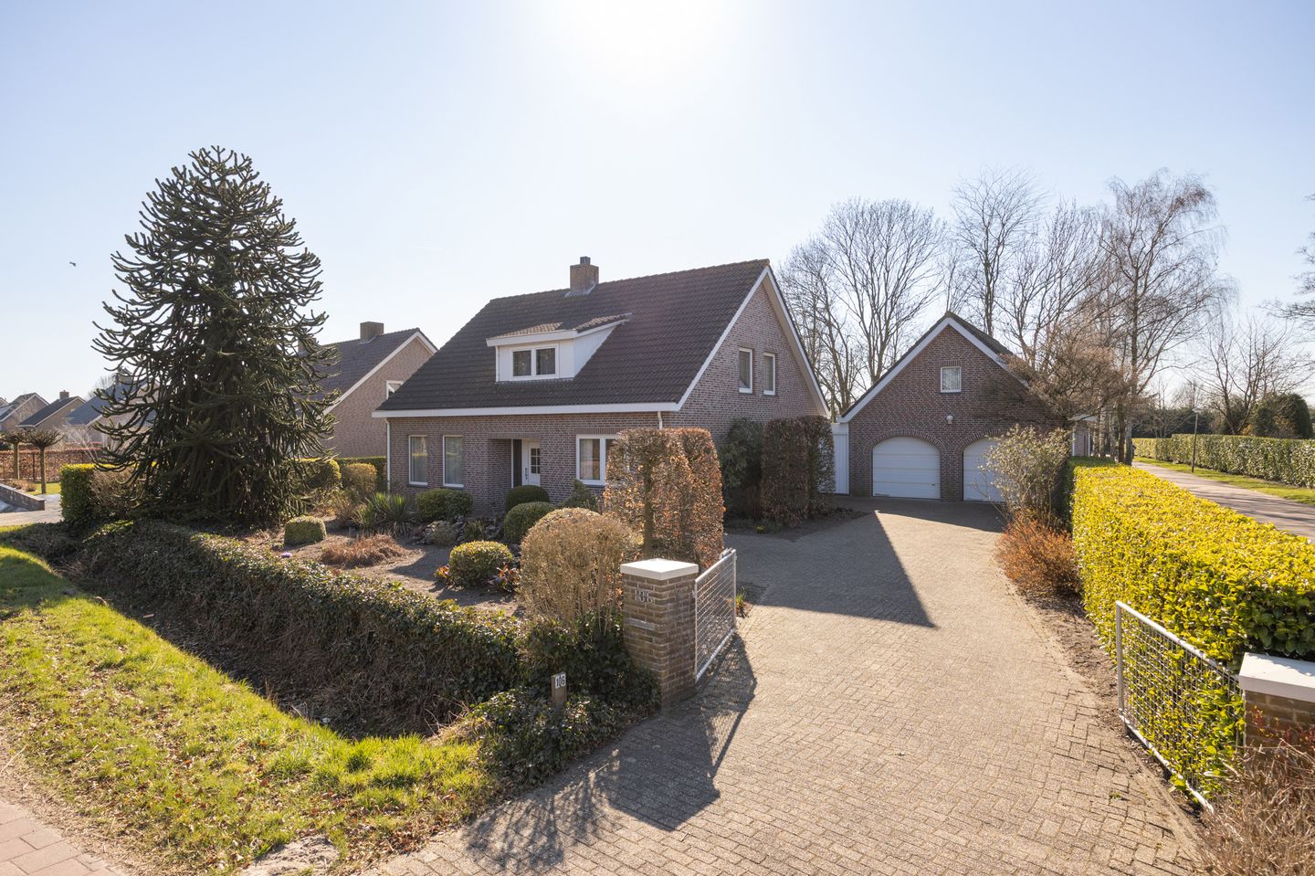 Bij aankomst valt direct de ruime oprit op, die leidt naar de garage. De fraai aangelegde voortuin, voorzien van sierbestrating en vaste planten, geeft de woning een uitnodigende uitstraling.