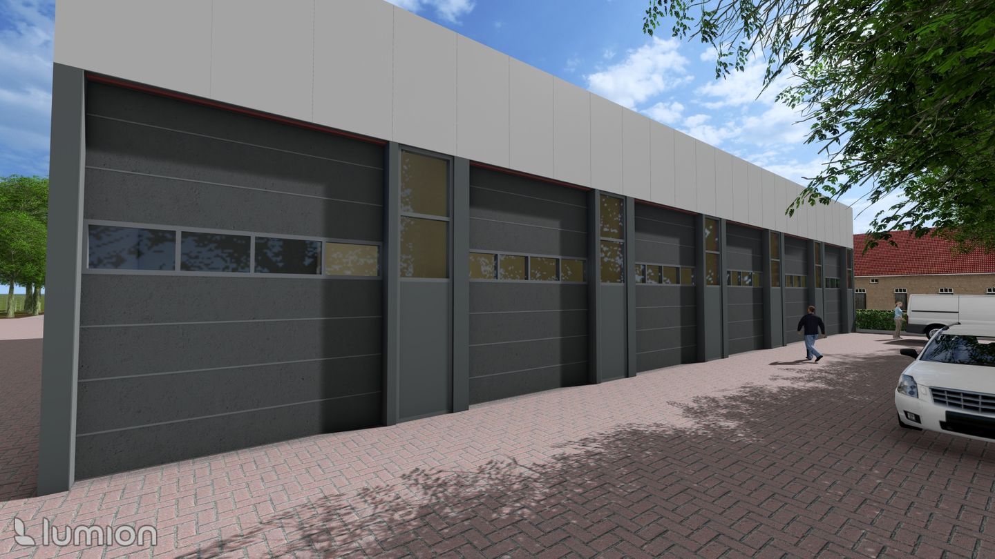 Bedrijfsruimte: entree, middels kunststof pui v.v. bovenlicht, meterkast en overheaddeur (3,75 m x 4.5 m¹), een elektrische aandrijving is optioneel.