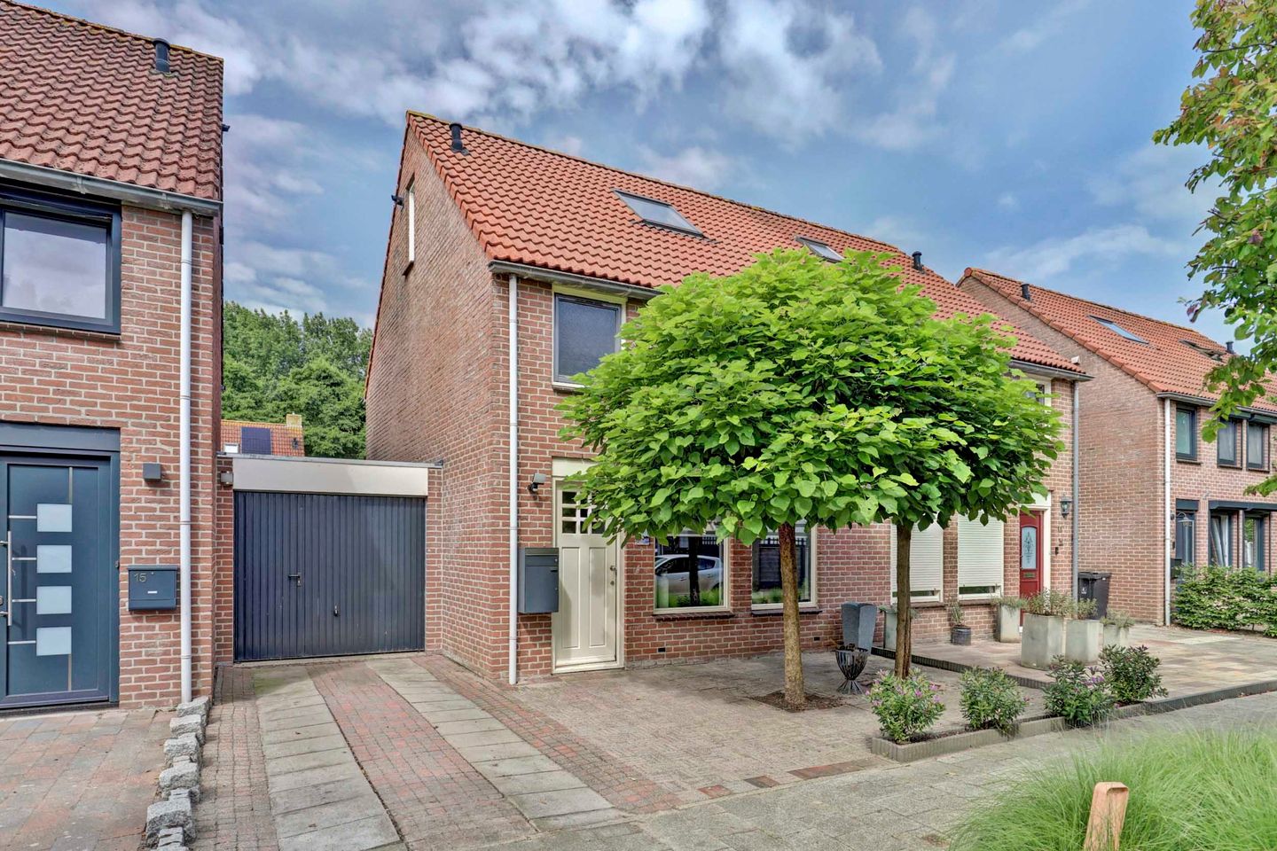 Bij aankomst valt direct de voortuin op, voorzien van sierbestrating en volwassen bomen die zorgen voor een aangename beschutting en uitstraling. De woning beschikt over een eigen oprit met parkeergelegenheid voor een auto. Deze oprit leidt naar de aangebouwde stenen garage van ruim 6 meter diep, perfect geschikt voor fietsen, opslag, hobbyruimte of het parkeren van een voertuig. U betreedt de woning via de entreehal, met een nette toiletruimte, meterkast en toegang tot de woonkamer. In het midden van de woning bevindt zich de trapopgang, stijlvol afgeschermd met een zwarte taatsdeur, wat een moderne en luxe uitstraling geeft aan het geheel.