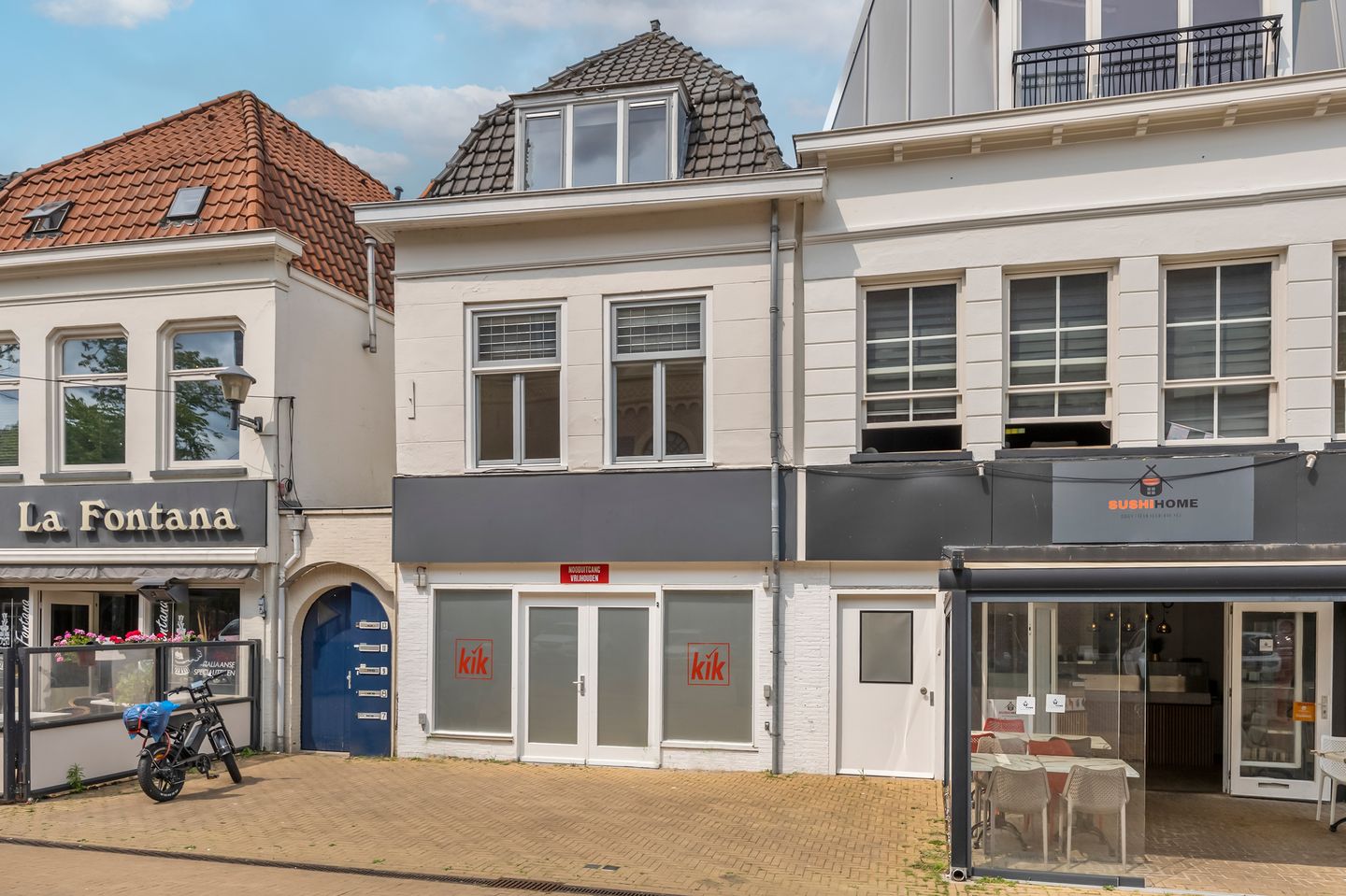 De sfeervolle woonkamer is voorzien van een nette laminaatvloer en karakteristieke ramen met glas-in-lood bovenlichten. De twee grote ramen bieden een charmant uitzicht op het bruisende stadsleven en de iconische Grote Kerk. Vanuit de woonkamer leidt een vaste trap naar de verdieping, en is er toegang tot de halfopen keuken.