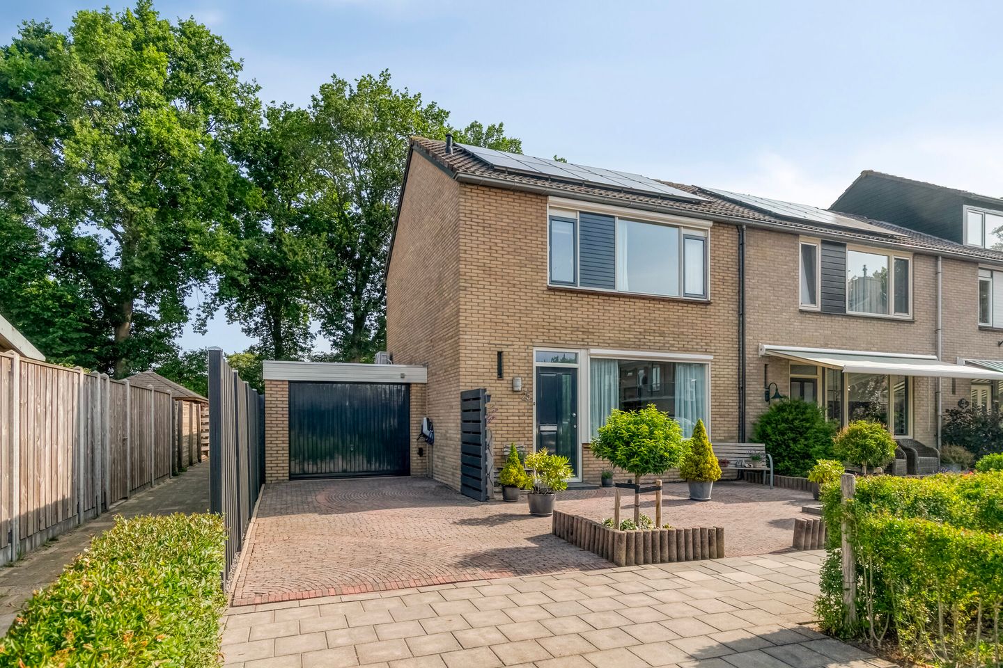 Aan de voorzijde beschikt u over een parkeerplaats op eigen terrein, laadpaal voor uw elektrische auto en voor de oprit kan een 2e auto geplaatst worden.