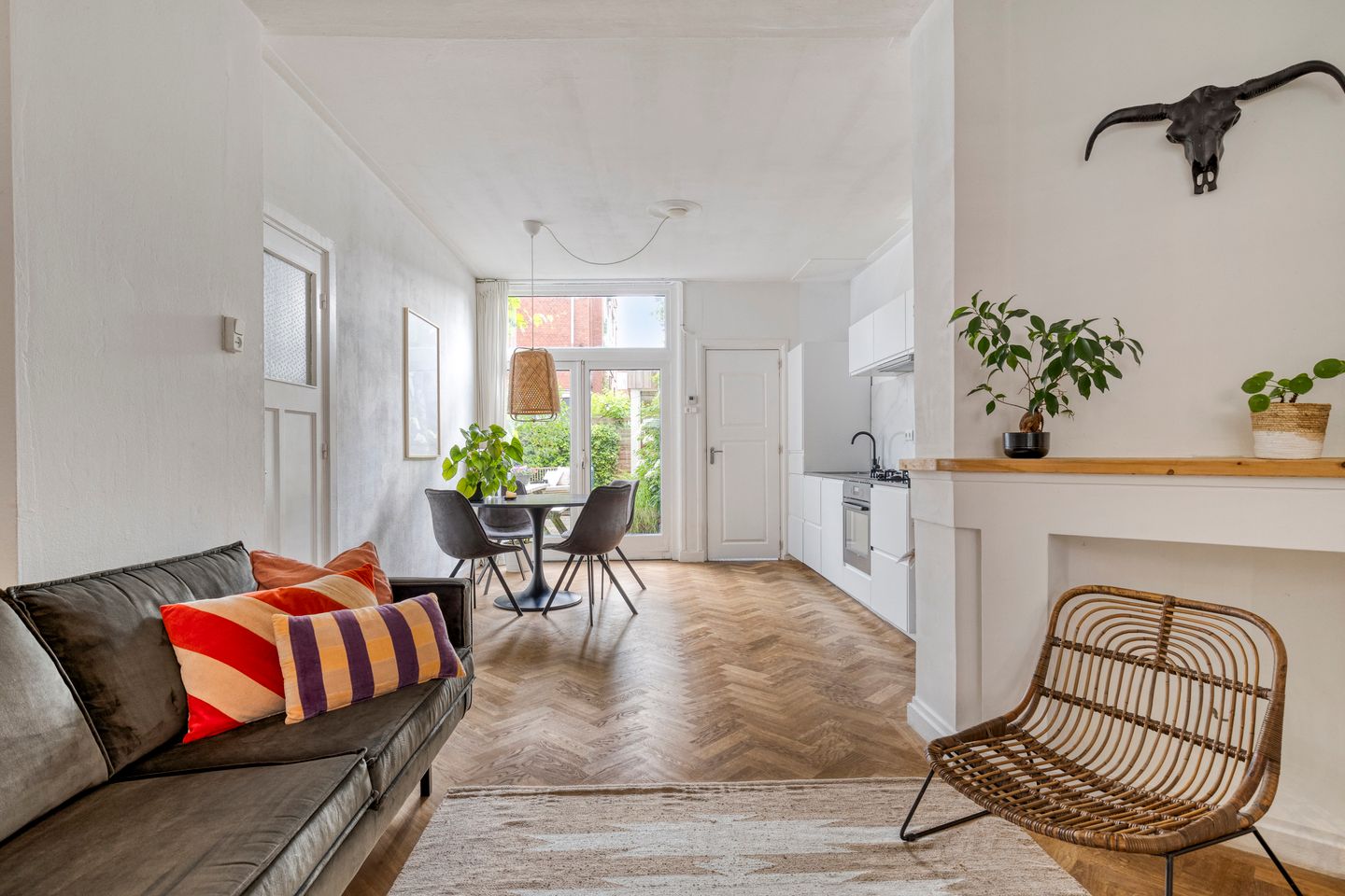 Via de openslaande deuren in de woonkamer loop je de gezellige stadstuin in, waar je van ’s ochtends vroeg tot in de namiddag van de zon kunt genieten. Dankzij de ligging op het zuidoosten is dit een heerlijke plek voor een ontbijtje in de zon of een borrel aan het eind van de dag.