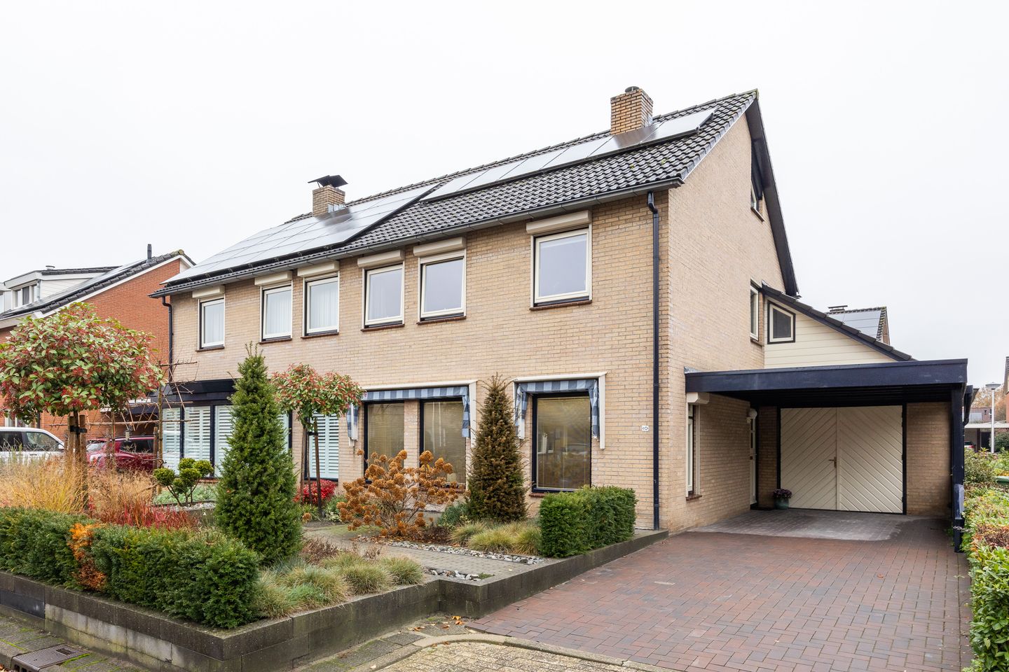 We beginnen onze ontdekkingstocht bij de in mei 2024 nieuw bestrate eigen oprit. Deze eindigt voor een ruime aangebouwde stenen garage, met pannendak en carport. De onderhoudsvriendelijke voortuin bestaat uit een leuke combi van sierbestrating en perken met vaste planten. De voordeur brengt ons in de hal met plavuizenvloer. Onder de hardhouten open trap is de garderobe ingericht. Ook de keurige tijdloze toiletruimte (hangtoilet, fonteintje) en meterkast bevinden zich in de hal. Een deur met roedeverdeling en glas geeft toegang tot de living.