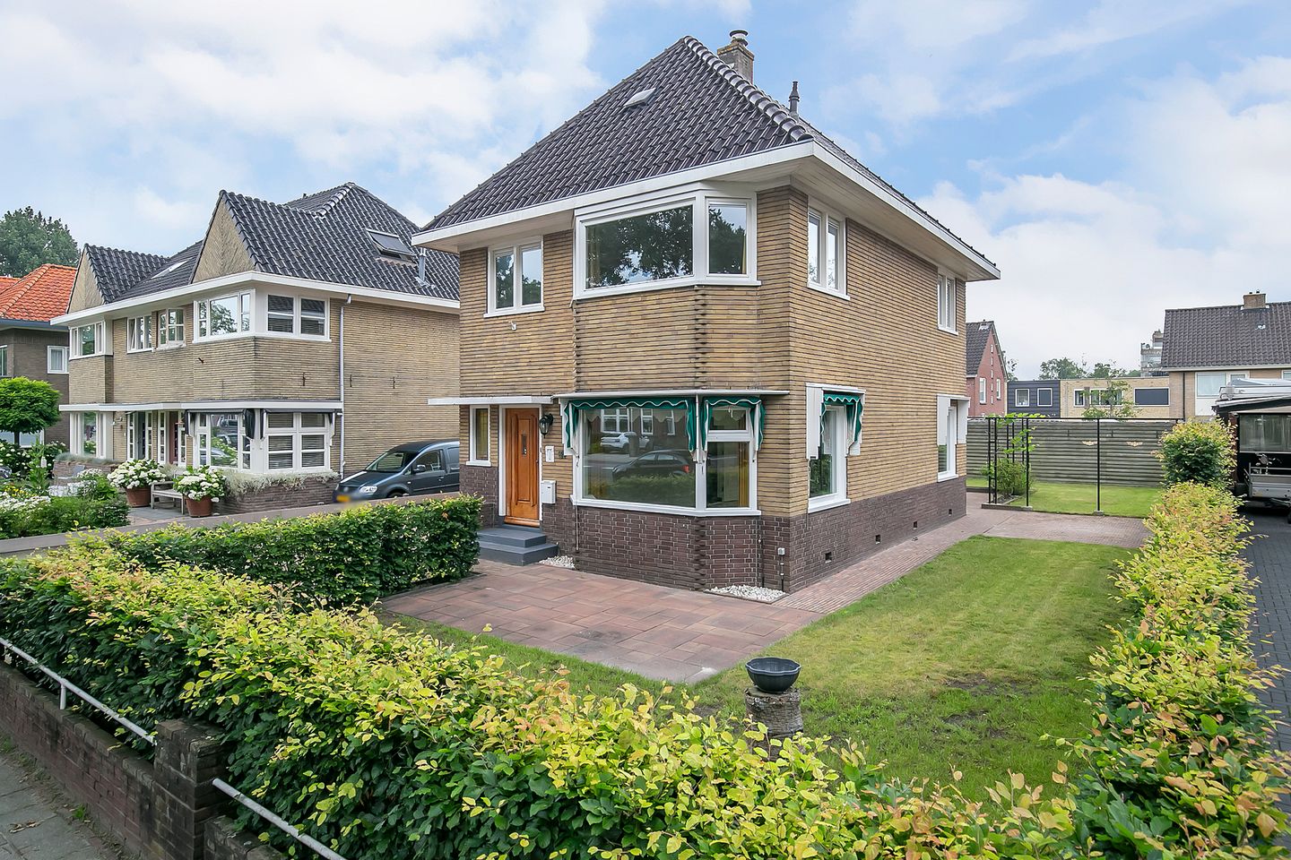 De tuin is netjes aangelegd en biedt veel mogelijkheden. De oprit is verbreed en biedt ruimte voor vier auto’s op eigen perceel. Dankzij de ligging geniet je van de zon, zowel in de achtertuin als in de zij- en voortuin zijn terrassen aanwezig.