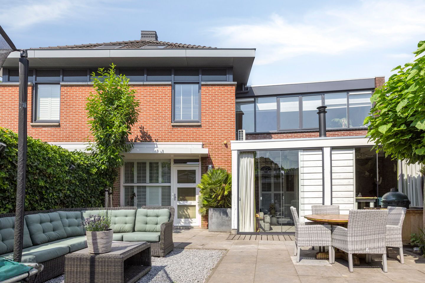 Via de schuifpui loop je zo de lichte tuinkamer in, die dankzij de glazen schuifwanden het hele jaar door een heerlijke plek is om te ontspannen. Zet in de zomer alles open en geniet van het buitenleven, of creëer juist een warme, knusse zithoek bij de houtkachel in de winter.