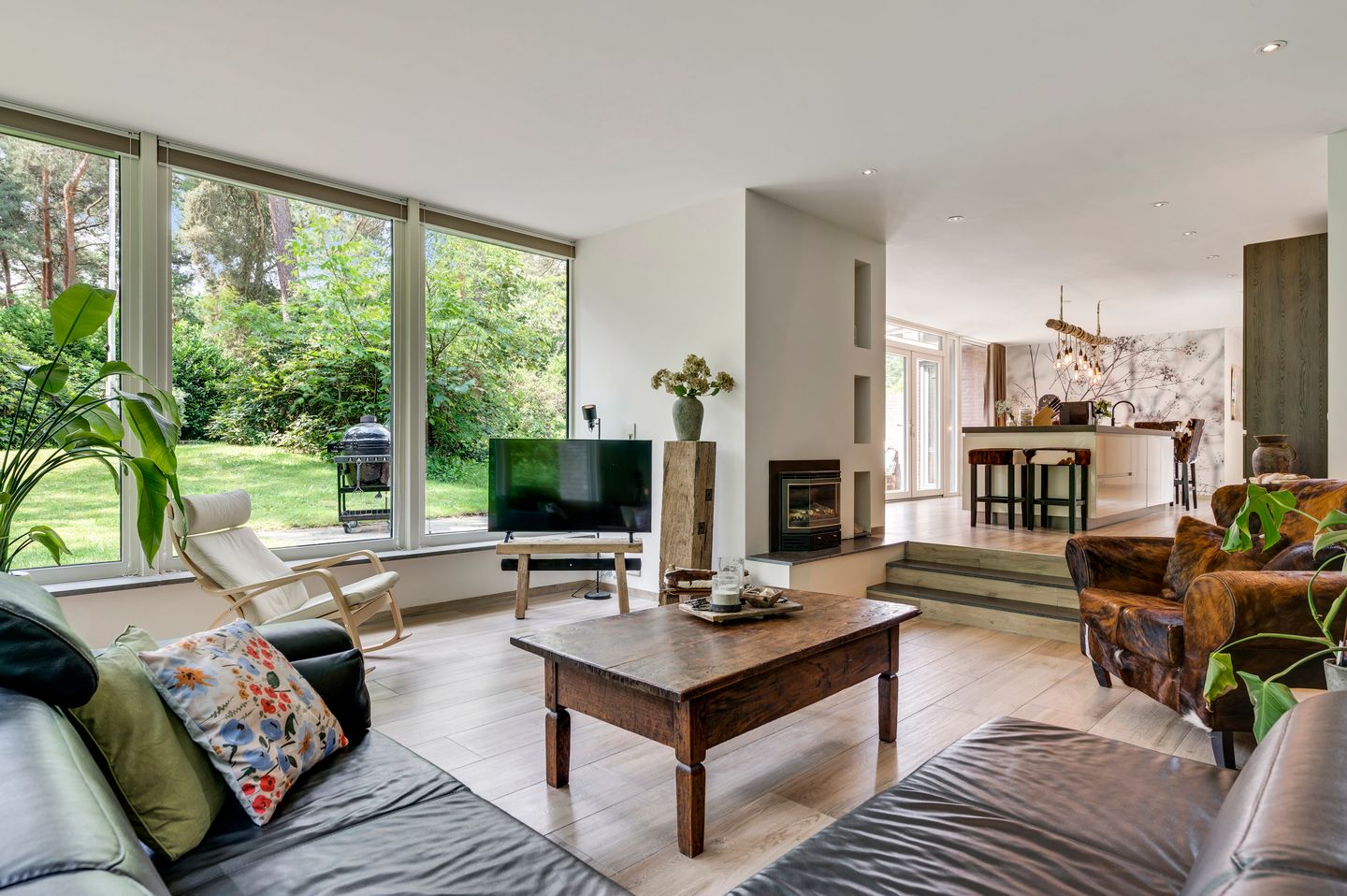 Twee treden lager ligt de sfeervolle zithoek, intiem en cosy dankzij de gashaard – dé plek voor rustige avonden of ontspannen weekenden.