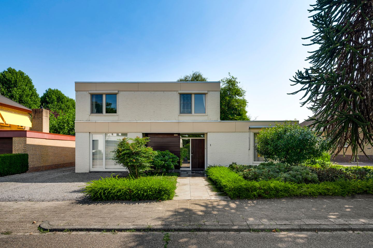 Het royale, kubistisch vormgegeven woonhuis wordt omringd door een mooi aangelegde tuin met