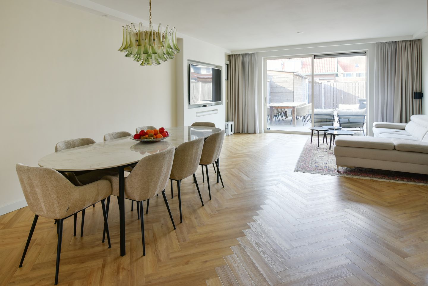 Via de prachtige hardhouten deur met glas bereikt u de royale en zeer lichte woonkamer.