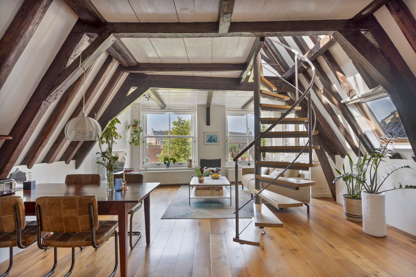 Je komt binnen in een nette hal die toegang biedt tot de verschillende vertrekken. De lichte woonkamer en keuken vormen samen een royale leefruimte met veel sfeer en authentieke elementen. Grote raampartijen zorgen voor een prettige lichtinval en een fraai uitzicht over de stad.