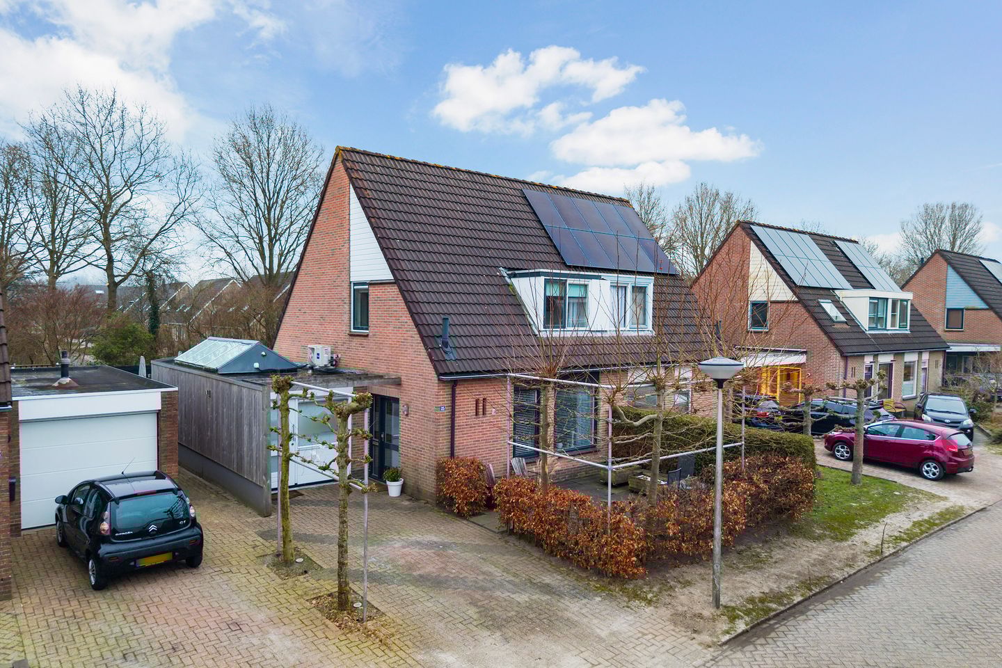 De achtertuin biedt volop terrasmogelijkheden en dankzij de ligging vind je altijd een zonnig of schaduwrijk plekje om te ontspannen. Dankzij een groenstrook met bomen en speeltuintje, grenzend aan de achtertuin, geniet je van veel privacy en een fraaie groene omgeving, terwijl een handige achterom toegang geeft tot de oprit. Ook de voortuin is een fijne, groene plek waar je tot in de late namiddag van de zon kunt genieten, omgeven door sierlijke Plataan leibomen die zowel sfeer, zonwering als privacy bieden. Daarnaast is er voldoende ruimte om een auto zowel op de eigen oprit als in de straat te parkeren.