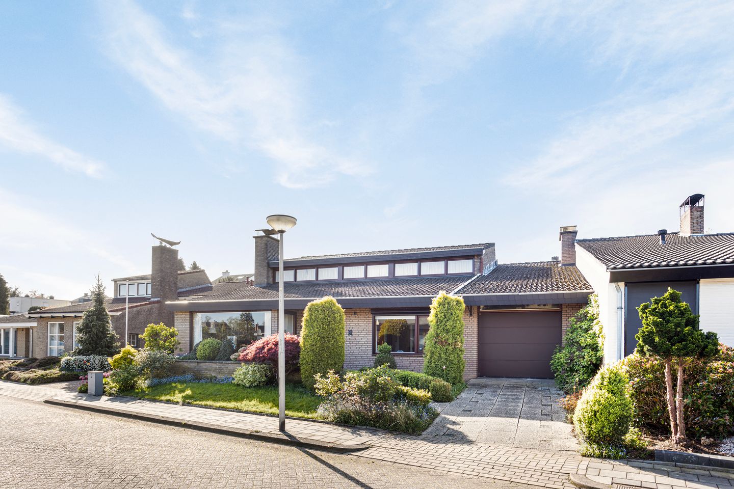 Nette aangelegde voortuin, oprit en garage.