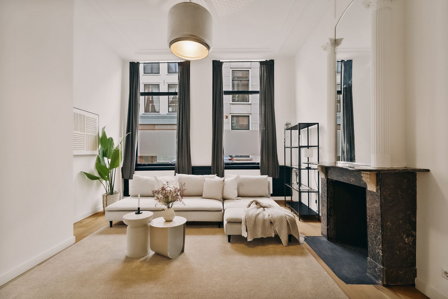 De woning beschikt over een ruime woonkeuken die centraal staat in het interieur. De houtkachel in de keuken is niet alleen functioneel, maar draagt ook bij aan de gezellige, warme sfeer van de ruimte. Dit is de ideale plek om te koken, te genieten van een maaltijd met vrienden en familie, of simpelweg te ontspannen bij het haardvuur. De keuken is van alle gemakken voorzien en biedt voldoende werkruimte voor de enthousiaste thuiskok. Aan de voorzijde van de woning bevindt zich de chique woonkamer, die ideaal is voor het ontvangen van gasten of het creëren van een ontspannen sfeer voor de dagelijkse momenten. De kamer heeft een verfijnde uitstraling, met behoud van de klassieke elementen die het monumentale pand kenmerken. Grote raampartijen zorgen ervoor dat de kamer altijd licht en luchtig aanvoelt, en geven uitzicht op de omliggende straat.