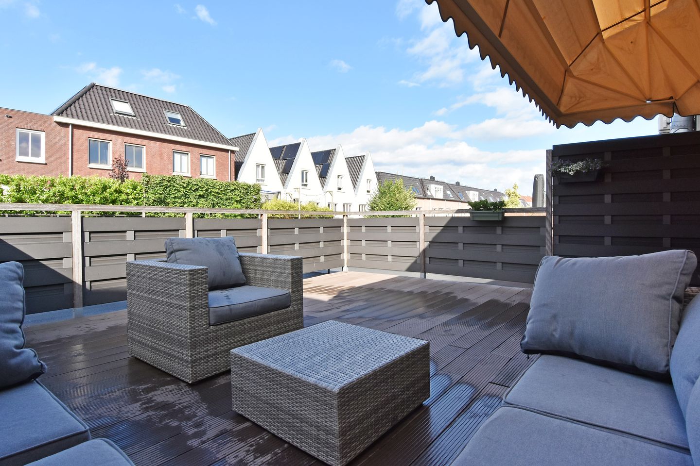 Het terras (ca. 6.00 x 5.45 m) is onderhoudsvriendelijk aangelegd met composiet vlonderplanken en een strakke antracietkleurige omheining. Voor extra comfort is er een groot zonnescherm type markies over de volle breedte van de woning.