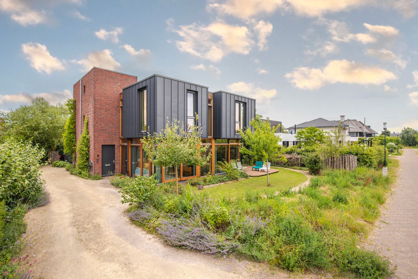Begane grond: langs de groene voortuin bereik je via de brede oprit, met een aansluiting voor het op eigen stroom opladen van je elektrische auto, de voordeur in de bakstenen achterbouw van de woning. Aan de ruime entree liggen het toilet en de meterkast plus een deur naar de centrale hal met trappenhuis in het middelpunt van de woning. De zitkamer en woonkamer bevinden zich aan de voorzijde, met uitzicht op het park. Beide vertrekken baden in het licht dankzij de grote vensterpartijen en schuifpuien aan weerszijden. De betonvloer zorgt in combinatie met het houtwerk van de kozijnen en de houten tussenwanden voor een strakke en tegelijk warme uitstraling. De doorkijk naar de vide en de ingebouwde verlichting in het plafond benadrukken de open sfeer van de woning. De keuken bevindt zich deels onder de trap en is uitgevoerd in stijlvol matzwart. Uiteraard is de keuken voorzien van alle apparatuur, van inductiekookplaat met ingebouwde afzuiging tot koelkast en vaatwasser. Terwijl je staat te koken, kun je dankzij de halfopen wandpanelen gezellig in gesprek blijven met het gezelschap aan tafel in de eetkamer. Ook hier geniet je weer van een zee aan licht en uitzicht op de heerlijk groene tuin. Naast de keuken is een praktische bijkeuken, waar zich ook de technische ruimte bevindt. Oftewel jouw eigen energiefabriek! De naastgelegen berging met vloerverwarming is bereikbaar via twee buitendeuren.