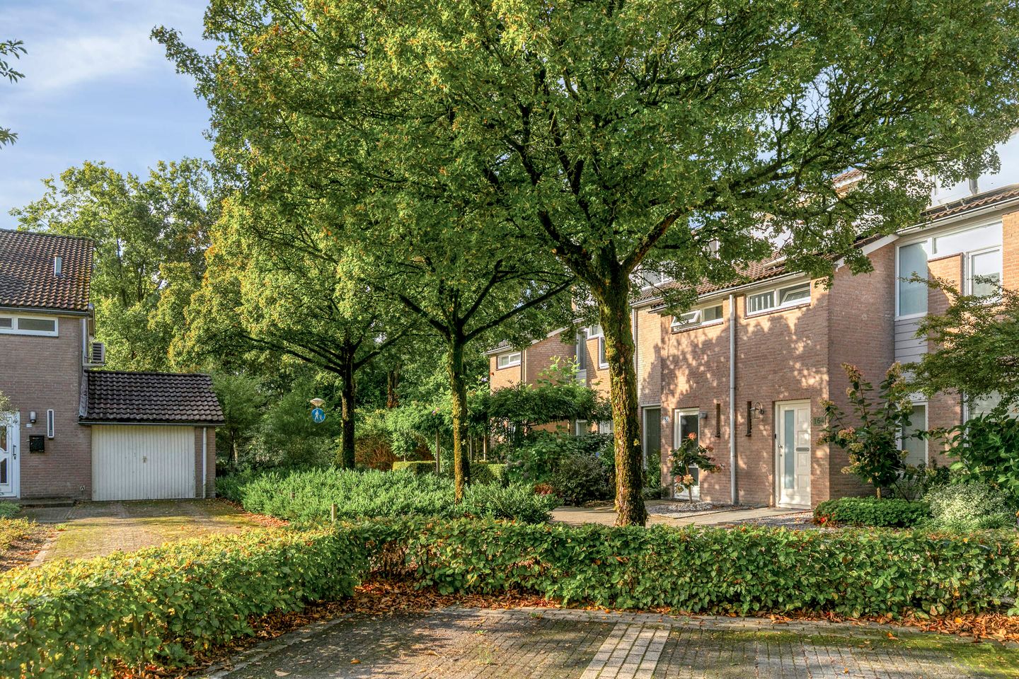 - Voorzijde. De woning grenst direct aan een voetpad, met veel openbaar groen in de omgeving en voldoende parkeergelegenheid in de straat.