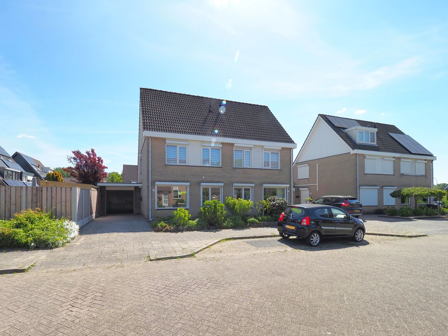 De keurig aangelegde en onderhouden voortuin is voorzien van een 10,75m lange oprit naar de garage, een bestraat gedeelte voor de voorgevel en een plantenborder met een diversiteit aan beplanting. De lange oprit naar de garage biedt parkeergelegenheid voor twee auto’s op eigen terrein.