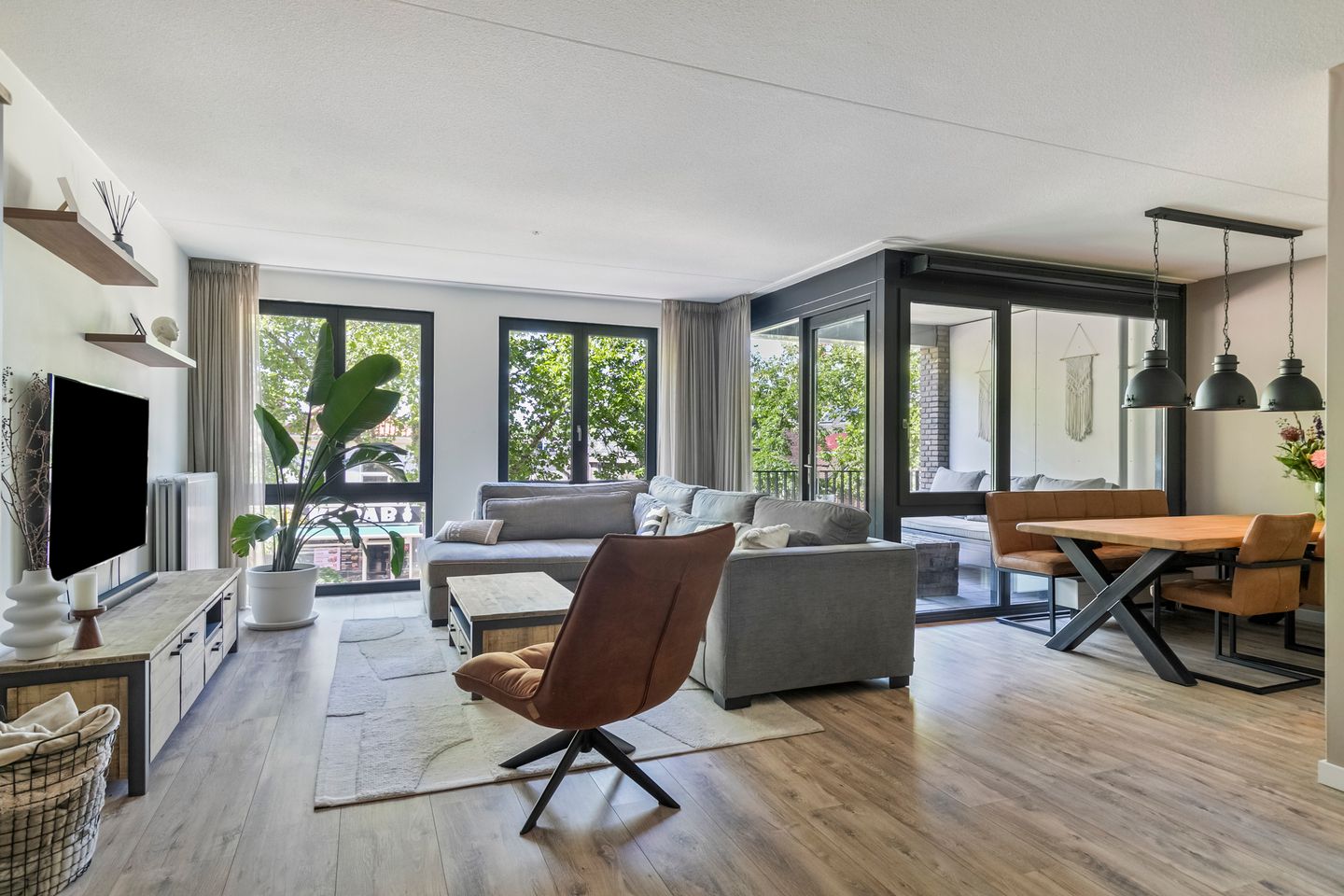Een bijzonder element is de loggia, die via een grote glazen ruiten van vloer tot plafond in de woonkamer is geïntegreerd. Deze loggia, een inpandig balkon, biedt het comfort van binnen en het gevoel van buiten, ideaal voor elk seizoen.