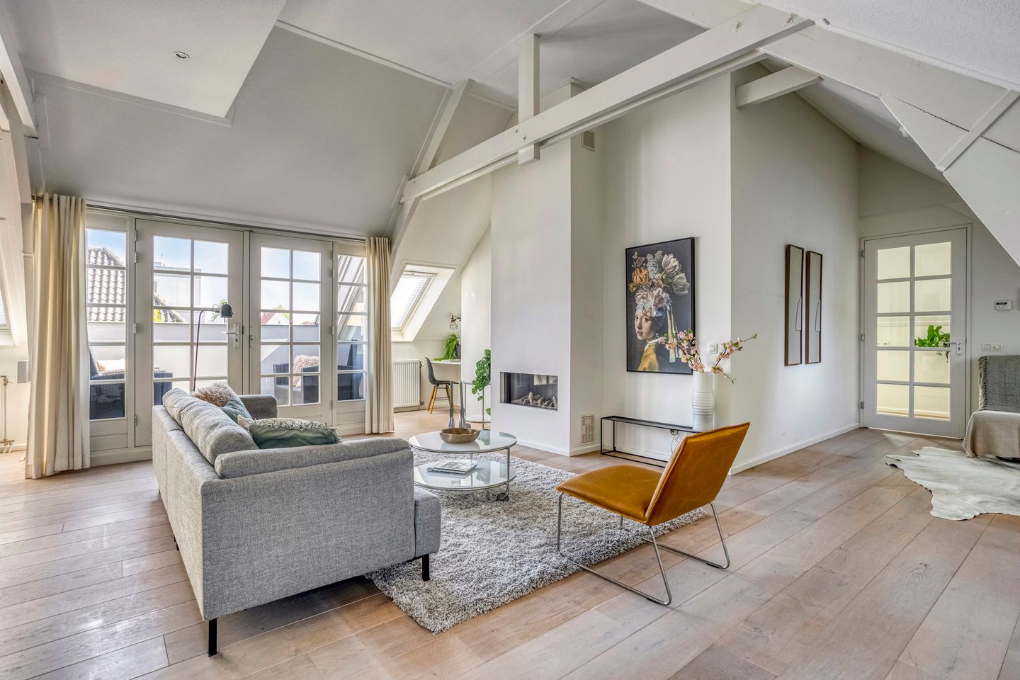 + De riante woonkamer krijgt een rijkelijke lichtinval via ramen aan beide zijden. De vele ramen en de open verbinding met de diverse hoeken creëren een heldere en ruimtelijke sfeer. Het centrale zitgedeelte heeft een in de wand geïntegreerde gashaard. Openslaande deuren geven hier een fijne verbinding met een ruime loggia. Om het centrale leefgedeelte heen bevinden zich verschillende sfeervolle zit-, eet- of werkplekken. Bij een dakraam is nu bijvoorbeeld een werkplek ingericht. Er is een tweede zithoek gerealiseerd bij een dakkapel. En de eettafel heeft een mooie plek gekregen tegenover de keuken, bij twee dakramen naast elkaar. Het plafond is uitgevoerd met spotverlichting. In het gehele woongedeelte is airco beschikbaar.