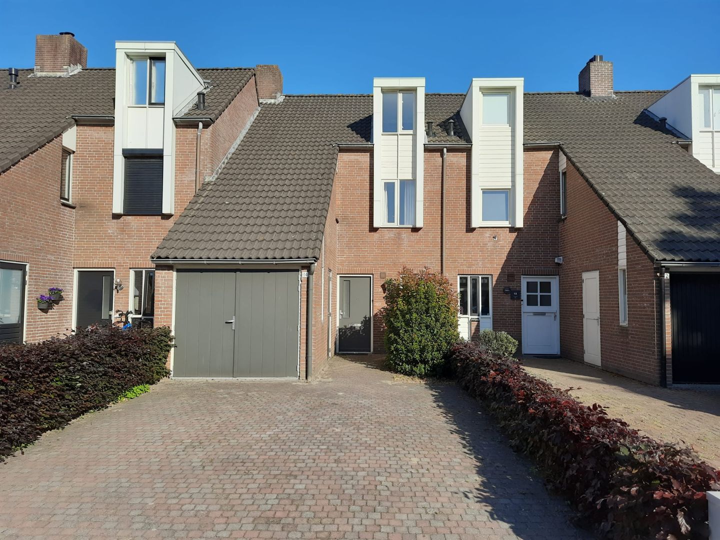 Voortuin met oprit voor twee auto’s. De achtertuin ligt op het zuidoosten, is fraai aangelegd met sierbestrating en borders, en beschikt over een brede overkapping én achterom. Aan de gevel is een elektrisch zonnescherm gemonteerd.