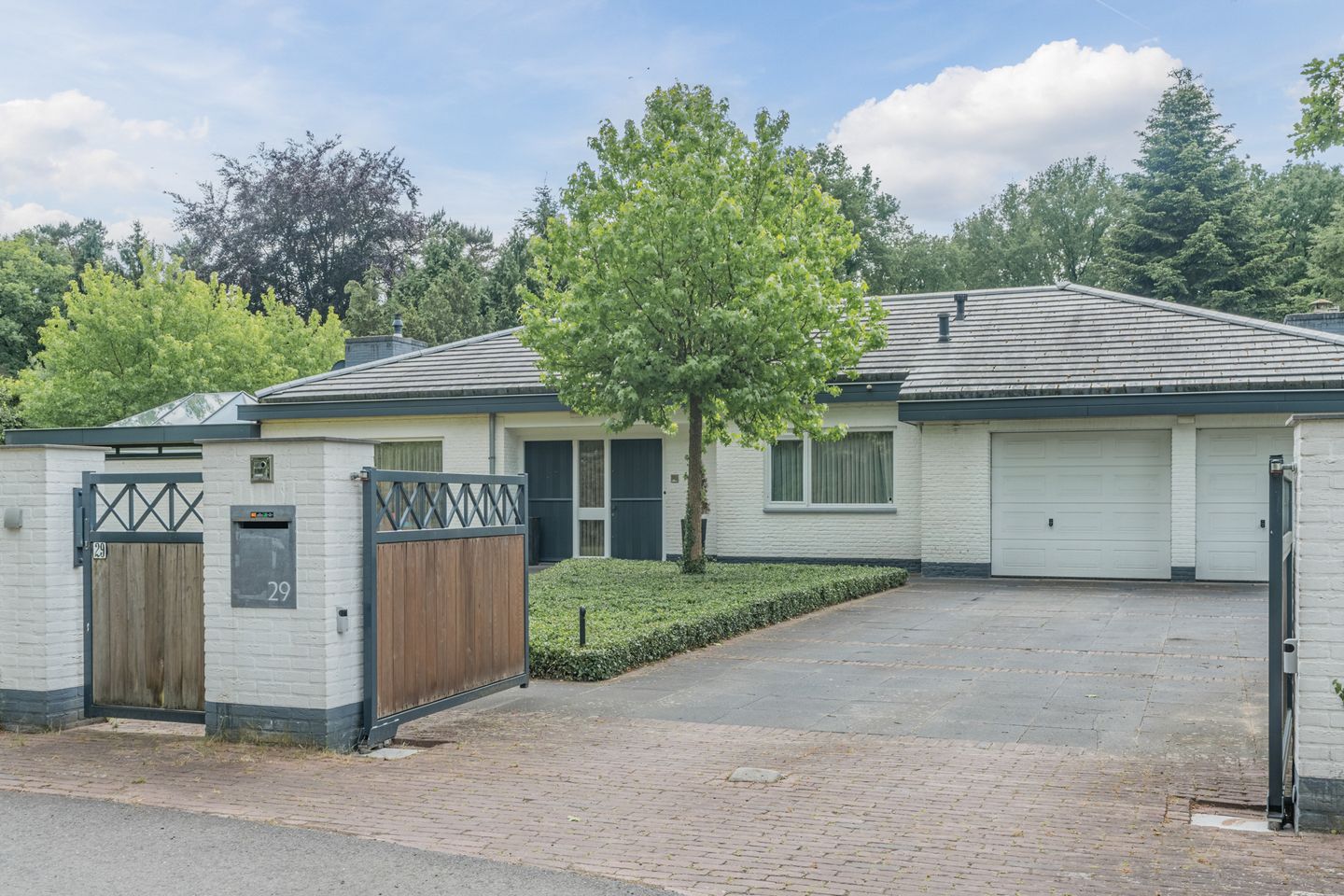 Toegang tot het geheel omheinde perceel middels een elektrisch bedienbare looppoort en een dubbele inrijpoort voor de auto’s welke tevens elektrisch bedienbaar is. Deze openen zich naar de verzorgde voortuin met parkeergelegenheid voor meerdere auto’s.