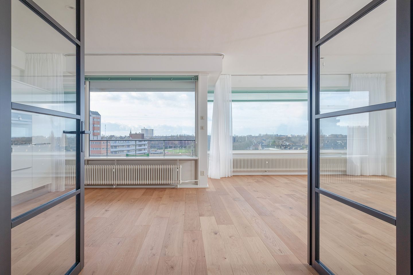 De lichte brede woonkamer kom je binnen via de openslaande deuren. Het uitzicht over de stad pakt je direct. Via de woonkamer heb je toegang tot het balkon, gelegen op het westen, waar je heerlijk kunt ontspannen in de middag- en avondzon.