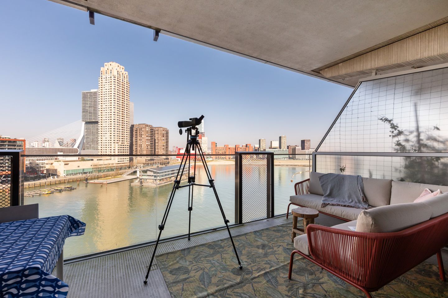 Geniet van de rust op het terras, terwijl je uitkijkt over de dynamische stad en het water. Dit appartement combineert het beste van twee werelden: de rust van het water en de levendigheid van Rotterdam.