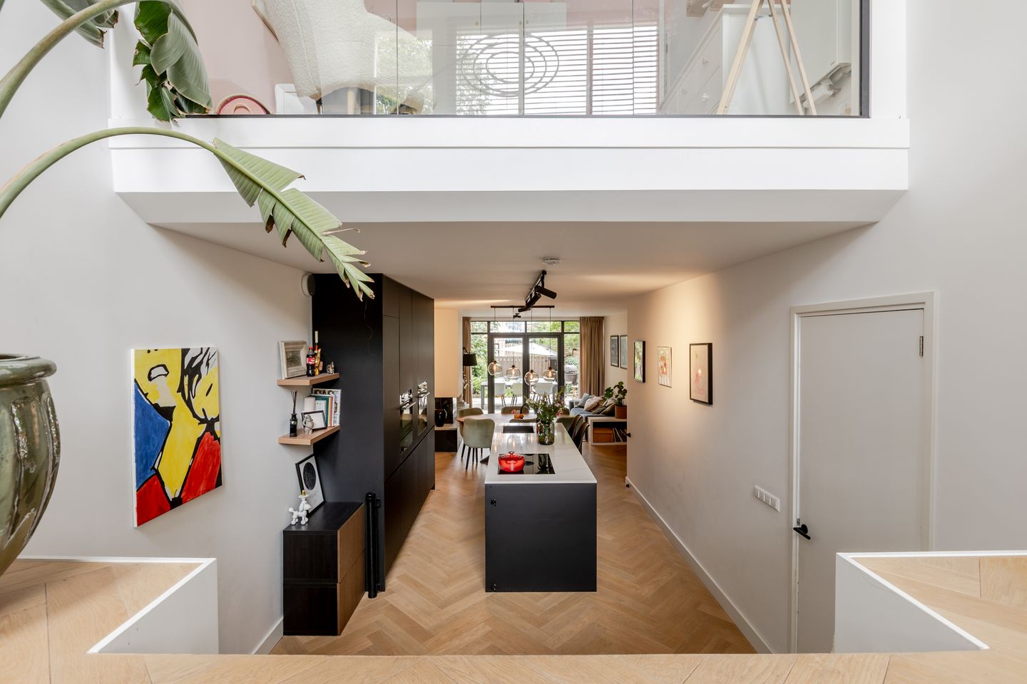 De royale en open entreehal, waar direct het gevoel van ruimte en grandeur je omarmt, heeft een plafondhoogte van ruim 4 meter en indrukwekkende raampartijen die reiken tot aan het plafond. Alsof je binnenstapt in de stijlvolle lobby van een boutique hotel. De stijlvolle, stoere trap leidt je naar het hart van de woning, de indrukwekkende leefkeuken op de begane grond. Hier staat het kook- en spoeleiland centraal, uitgevoerd in een modern design met hoogwaardige afwerking. Het lichte blad met de donkere kasten, de geïntegreerde apparatuur en het strakke lijnenspel geven de keuken een elegante uitstraling. Rondom het eiland is er volop ruimte om aan te schuiven, ideaal voor een goed glas wijn tijdens het koken of een goed gesprek terwijl de gerechten pruttelen.