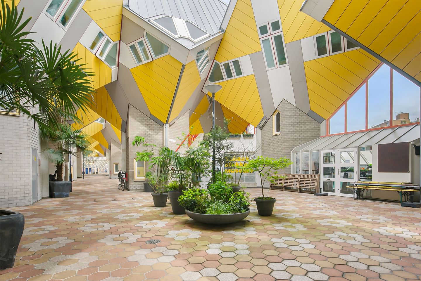 Eén van de meest iconische appartementen van Rotterdam staat te koop: een 'Kubuswoning' van architect Piet Blom. De kenmerkende gele buitenkant is al op afstand zichtbaar. Er zijn er maar 38 van in de wereld en ze behoren tot de meest gefotografeerde gebouwen van Rotterdam.