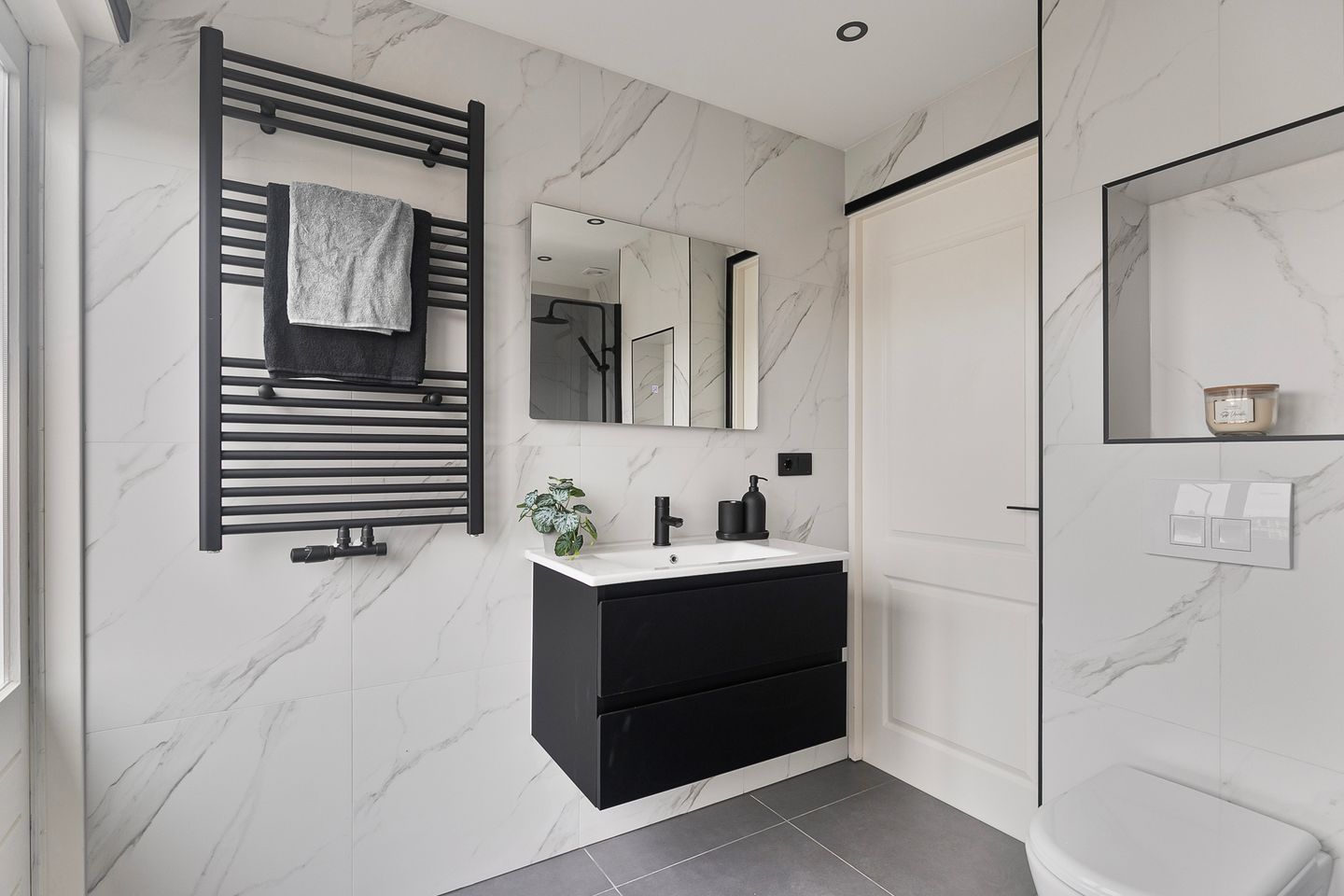 – Keurig wit betegelde badkamer (ca. 2,10 x 3,00m) met (inloop)douche, toilet, wastafel, design radiator en toegang tot het balkon