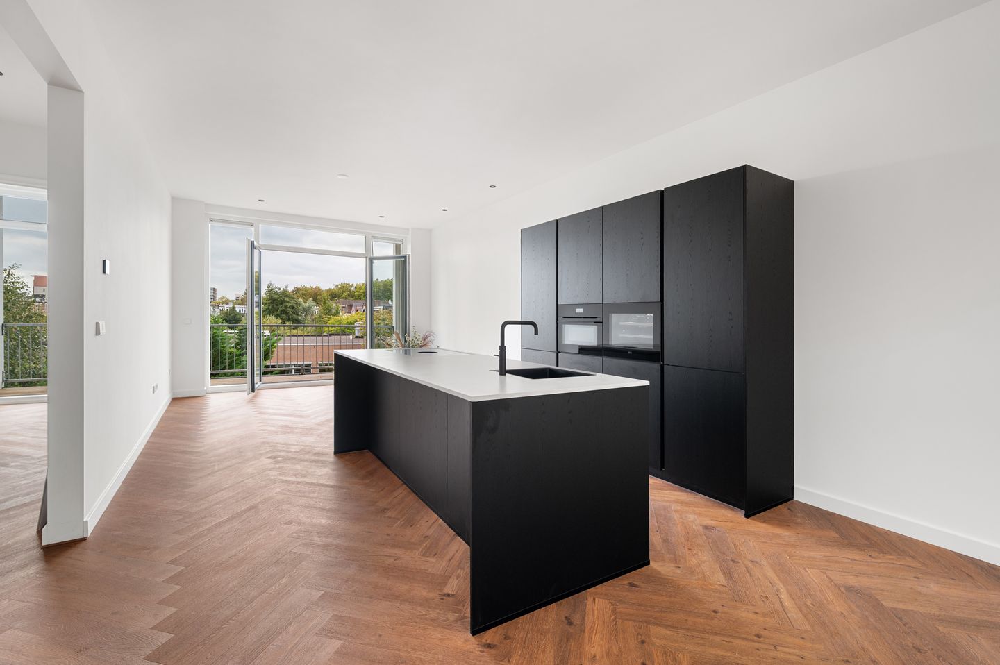 Via de entree kom je via een lange trap binnen op de derde verdieping. Hier ontvouwt zich een indrukwekkende leefruimte die bijna de hele verdieping beslaat. De hoge plafonds van bijna drie meter en de brede raampartijen geven de woonkamer een grandioos gevoel van licht en ruimte. Aan de achterzijde strekken openslaande deuren zich uit naar het balkon, waar je uitkijkt over de groene binnentuinen.