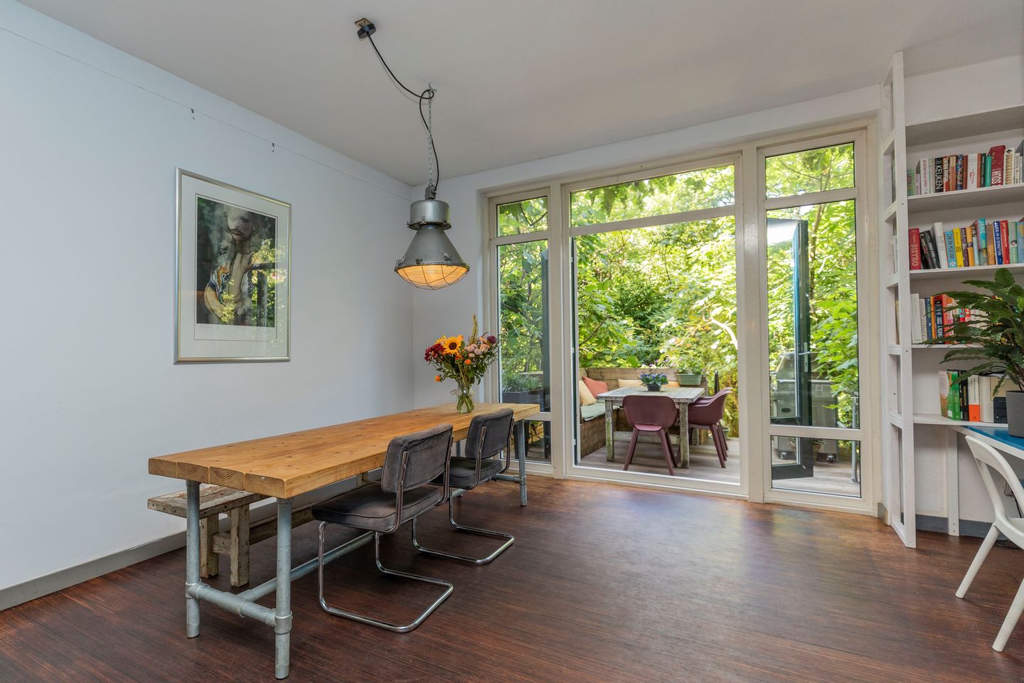 Aan de achterzijde vind je een fijne, lichte ruimte die uitermate geschikt is voor een grote eettafel, dé plek voor lange diners met vrienden of gezellige familiemomenten. Via de openslaande deuren stap je zo het verhoogde vlonderterras op, waar je uitkijkt over de diepe tuin. Hier geniet je van de middag- en avondzon. Een ideale plek voor lange zomerse avonden.
