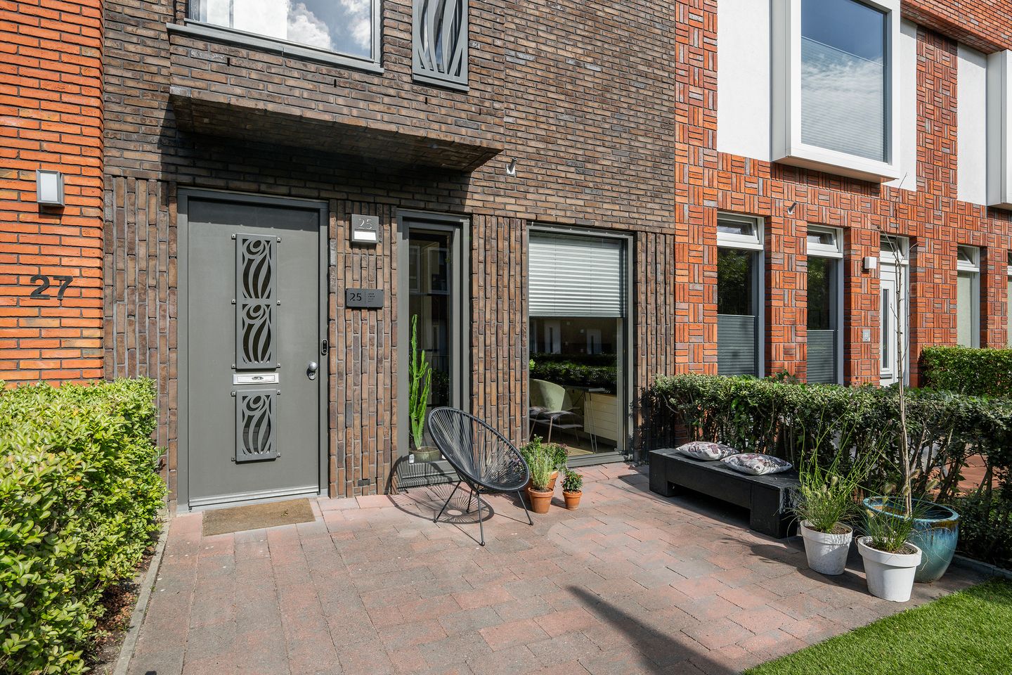 De woning beschikt over een ruime voortuin met zitje.
