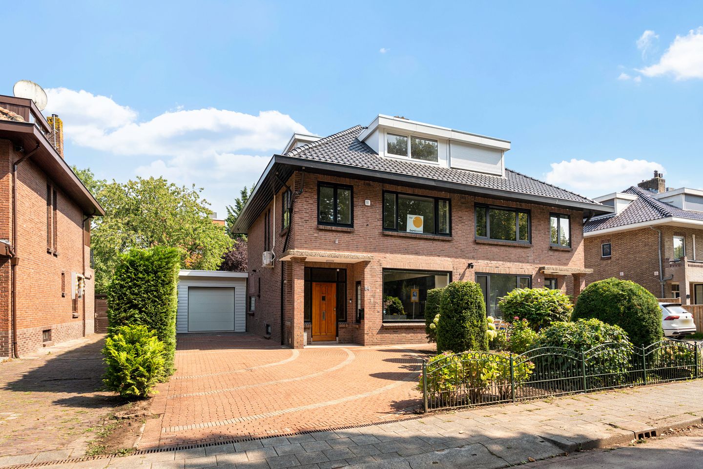 De woning beschikt over een voortuin met een ruime oprit met plek voor meerdere auto’s. Ook de garage biedt voldoende ruimte voor een auto. De garage is voorzien van water, ramen, een zijdeur naar de woonkamer en een achterdeur naar de tuin. Hierdoor kun je hem multifunctioneel gebruiken, bijvoorbeeld als aanleunwoning, kantoor aan huis, gastenverblijf of ruimte voor een au pair.